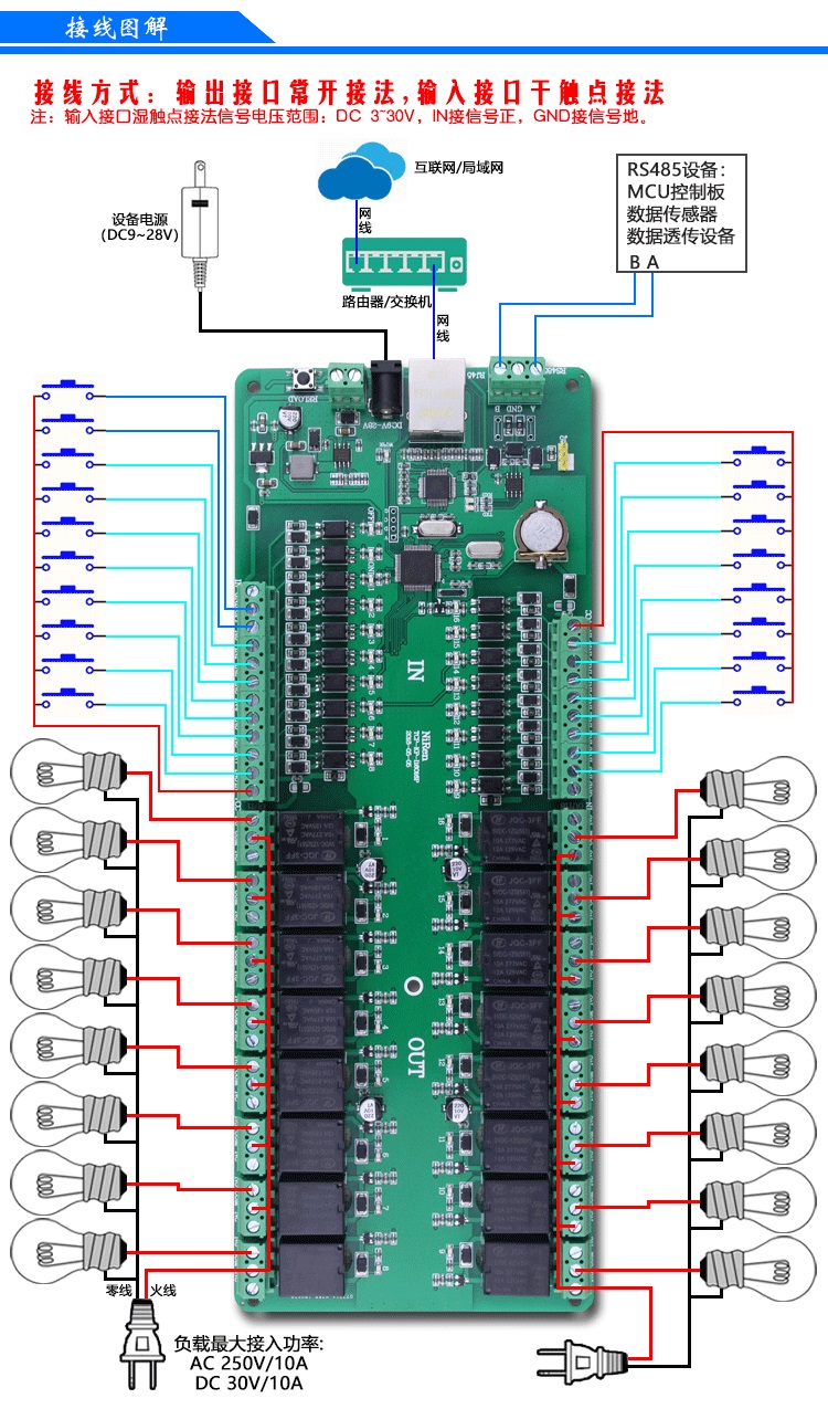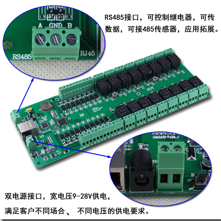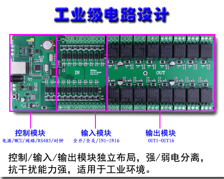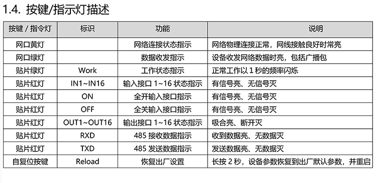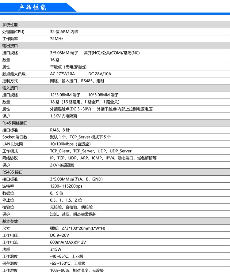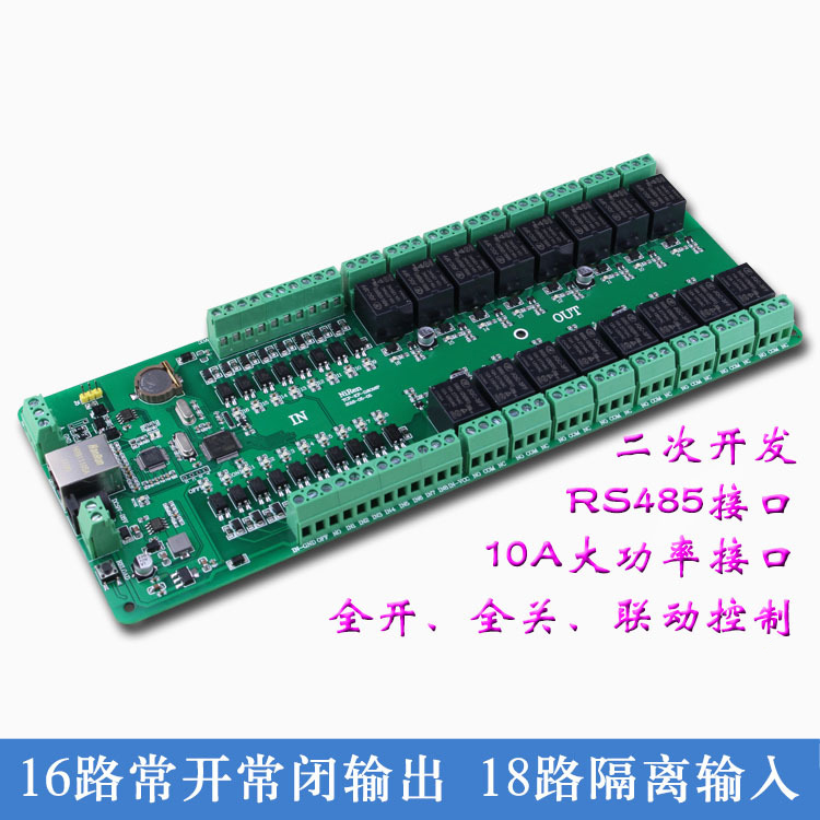 ??? 設(shè)備采用工業(yè)級(jí)設(shè)計(jì)方案,搭載32 ARM 處理器和10/100M 以太網(wǎng)網(wǎng)絡(luò)方案,具有速度快,運(yùn)算能力強(qiáng),穩(wěn)定性高,抗干擾能力強(qiáng)等特點(diǎn),滿足工業(yè)環(huán)境使用要求。設(shè)備有16 路繼電器輸出、18 路開關(guān)量隔離輸入和1 RS485 接口,繼電器支持實(shí)時(shí)控制、延時(shí)控制、輸入輸出聯(lián)動(dòng)控制、一鍵全開全關(guān)控制、日循環(huán)定時(shí)控制和自定義日期控制等多種控制方式,開關(guān)量輸入狀態(tài)支持被動(dòng)上傳、定時(shí)上傳和觸發(fā)上傳,RS485 接口支持用于控制設(shè)備或傳輸數(shù)據(jù),以滿足更多不同的場合使用,滿足更多用戶的使用需求。