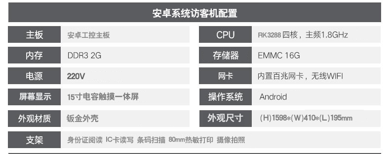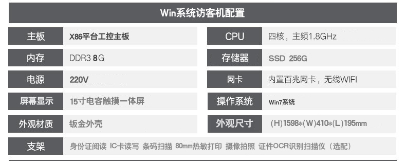 ?? ? ?15寸立式訪客機(jī)整機(jī)采用流線性設(shè)計(jì),符合人體工程原理,結(jié)構(gòu)合理,外形美觀大方,操作簡(jiǎn)單,維護(hù)方便;集成身份證閱讀 、IC卡讀寫、 條碼掃描、 80mm熱敏打印、 攝像拍照、 多種證件OCR識(shí)別掃描(選配)功能,支持安卓和Windows系統(tǒng) ;產(chǎn)品主要用于政府機(jī)關(guān)、軍隊(duì)、公安、法院、學(xué)校、事業(yè)單位、花園小區(qū)、高檔寫字樓、工廠等場(chǎng)所的門衛(wèi)傳達(dá)室對(duì)進(jìn)出人員信息化登記人證核驗(yàn),從而代替了傳統(tǒng)的手工登記,有效的提高了門衛(wèi)管理工作效率及證件信息登記準(zhǔn)確性,給日后的信息查詢工作更方便量更快捷。