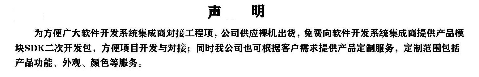 ? ? ? ? ??為方便廣大軟件開發(fā)系統(tǒng)集成商對(duì)接工程項(xiàng),公司供應(yīng)裸機(jī)出貨,免費(fèi)向軟件開發(fā)系統(tǒng)集成商提供產(chǎn)品模塊SDK二次開發(fā)包,方便項(xiàng)目開發(fā)與對(duì)接;同時(shí)我公司也可根據(jù)客戶需求提供產(chǎn)品定制服務(wù),定制范圍包括產(chǎn)品功能、外觀、顏色等服務(wù)。