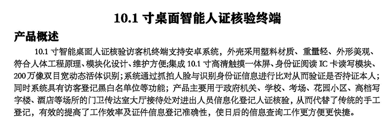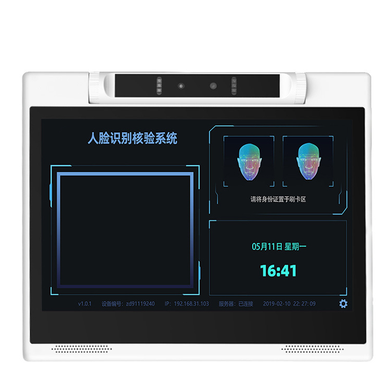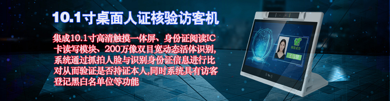 10.1寸智能桌面人證核驗(yàn)訪(fǎng)客機(jī)終端支持安卓系統(tǒng),外殼采用塑料材質(zhì)、重量輕、外形美觀(guān)、符合人體工程原理、模塊化設(shè)計(jì)、維護(hù)方便;集成10.1寸高清觸摸一體屏、身份證閱讀IC卡讀寫(xiě)模塊、200萬(wàn)像雙目寬動(dòng)態(tài)活體識(shí)別;系統(tǒng)通過(guò)抓拍人臉與識(shí)別身份證信息進(jìn)行比對(duì)從而驗(yàn)證是否持證本人;同時(shí)系統(tǒng)具有訪(fǎng)客登記黑白名單位等功能;產(chǎn)品主要用于政府機(jī)關(guān)、學(xué)校、考場(chǎng)、花園小區(qū)、高檔寫(xiě)字樓、酒店等場(chǎng)所的門(mén)衛(wèi)傳達(dá)室大廳接待處對(duì)進(jìn)出人員信息化登記人證核驗(yàn),從而代替了傳統(tǒng)的手工登記,有效的提高了工作效率及證件信息登記準(zhǔn)確性,使日后的信息查詢(xún)工作更方便更快捷。