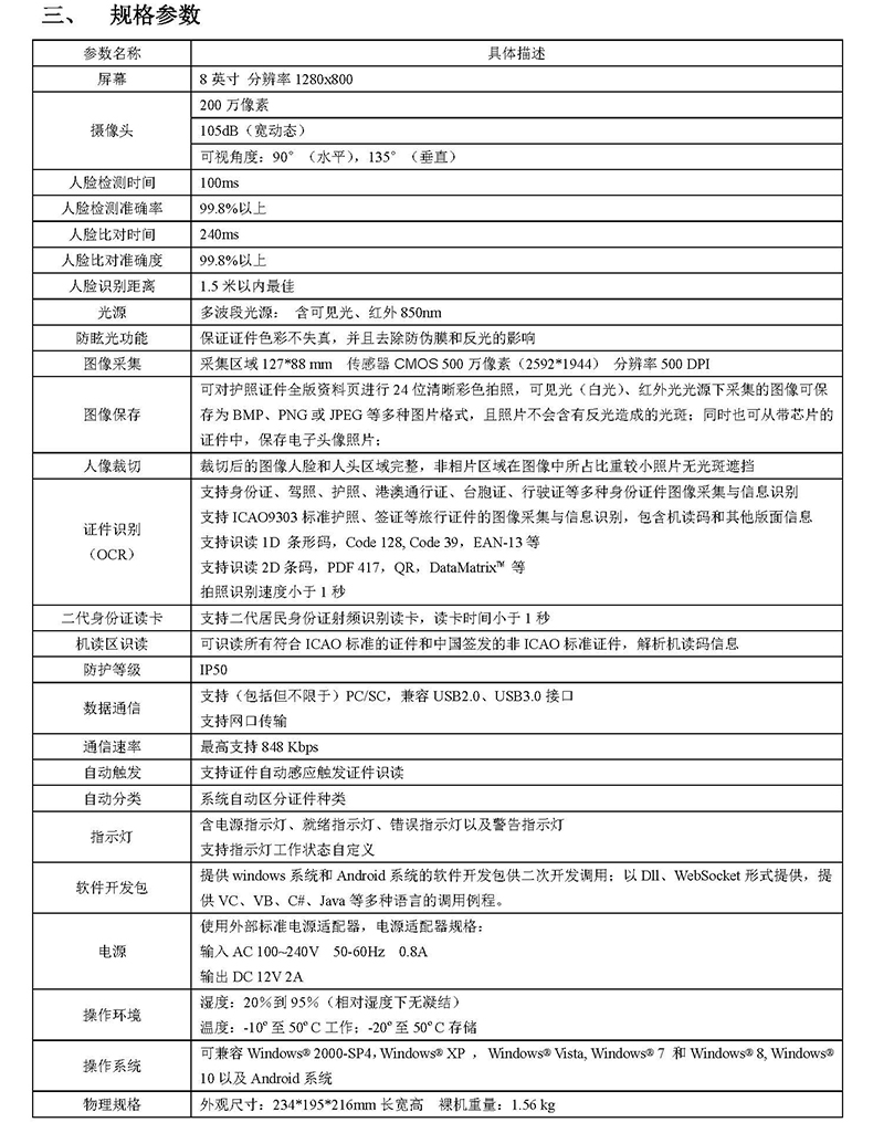 6) 高清拍攝,清晰視角:證件識別攝像頭500萬像素高清成像,物理分辨率達(dá)到500DPI;可見光采集圖像、紅外光識別;