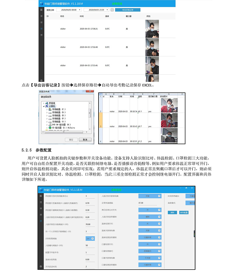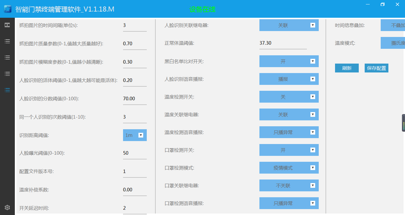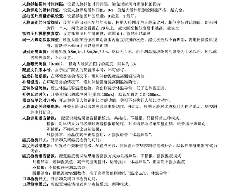???用戶可設(shè)置人臉抓拍的關(guān)鍵參數(shù)和開(kāi)關(guān)設(shè)備功能。設(shè)備支持人臉識(shí)別比對(duì)、體溫檢測(cè)、口罩檢測(cè)三大功能,用戶可自由組合配置開(kāi)關(guān)功能,是否關(guān)聯(lián)控制繼電器,是否播報(bào)語(yǔ)音提醒等。例如用戶要求體溫正常即可開(kāi)門,則開(kāi)啟體溫檢測(cè)功能,其余關(guān)閉即可實(shí)現(xiàn);若用戶要求規(guī)定的人,體溫正常且佩戴口罩后才可以開(kāi)門,則必須同時(shí)開(kāi)啟人臉識(shí)別比對(duì)、體溫檢測(cè)、口罩檢測(cè),當(dāng)此三項(xiàng)全部檢測(cè)正常才會(huì)控制繼電器開(kāi)門。配置界面和具體詳細(xì)如下所述。