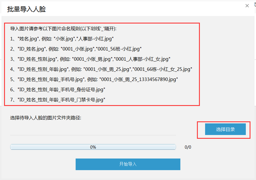 點(diǎn)擊【批量導(dǎo)入】,彈出界面è點(diǎn)擊【選擇目錄】,選擇人臉圖片文件夾è點(diǎn)擊【開(kāi)始導(dǎo)入】,導(dǎo)入進(jìn)度條完成即完成批量導(dǎo)入人臉操作。
