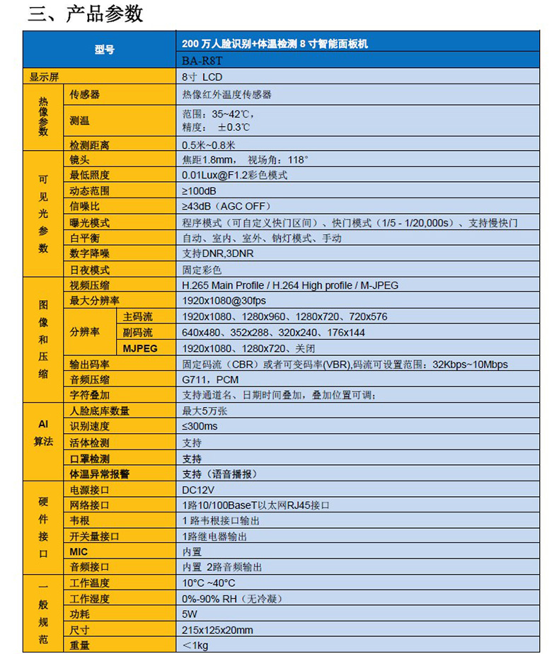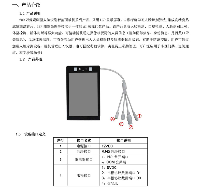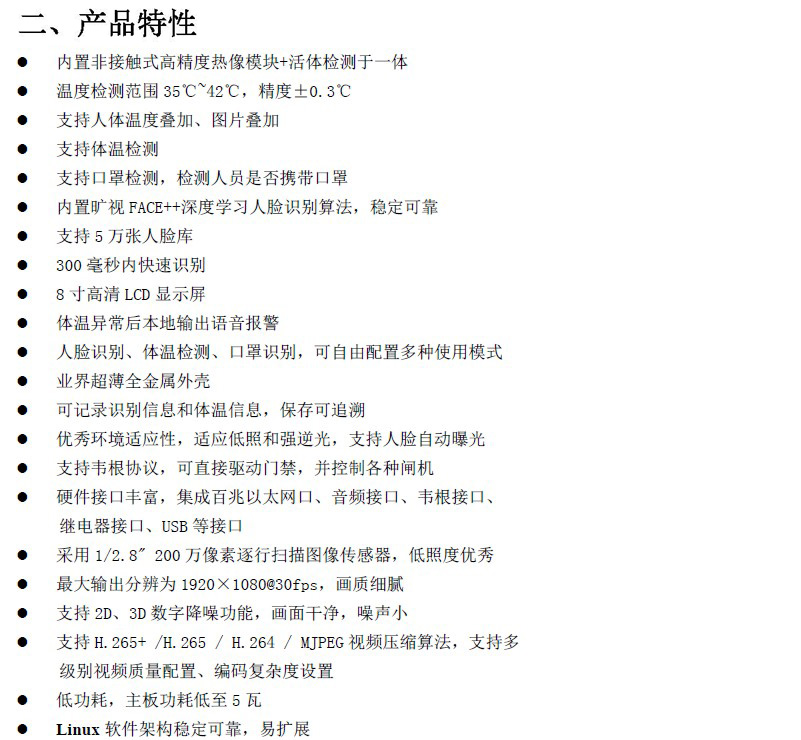 200萬(wàn)像素測(cè)溫人臉識(shí)別智能面板機(jī)系列產(chǎn)品,采用LCD顯示屏幕,內(nèi)嵌深度學(xué)習(xí)人臉識(shí)別算法,集成高精度熱成像測(cè)溫芯片,ISP圖像處理等技術(shù)于一體的AI智能門禁產(chǎn)品。該產(chǎn)品具備人臉檢測(cè)、口罩檢測(cè)、人臉識(shí)別比對(duì)、體溫檢測(cè)、活體判斷等強(qiáng)大功能??删_捕獲通過(guò)攝像機(jī)視野的人員信息(諸如面部信息、身份信息、是否戴口罩等信息)、以及體表溫度??捎行椭脩艄芾沓鋈肴藛T權(quán)限以及監(jiān)測(cè)器體溫狀態(tài),有助于防范疫情。用戶可通過(guò)加載人臉庫(kù)到設(shè)備,脫機(jī)管理出入權(quán)限。也可搭配考勤軟件,實(shí)現(xiàn)員工考勤管理。可廣泛應(yīng)用于小區(qū)門禁、道閘通道、寫字樓等場(chǎng)景!