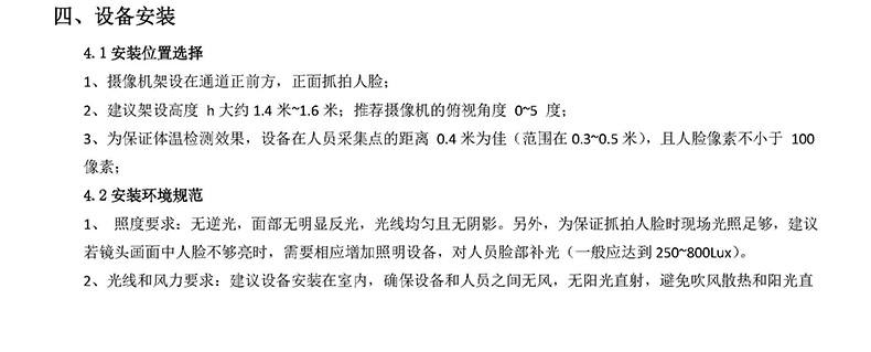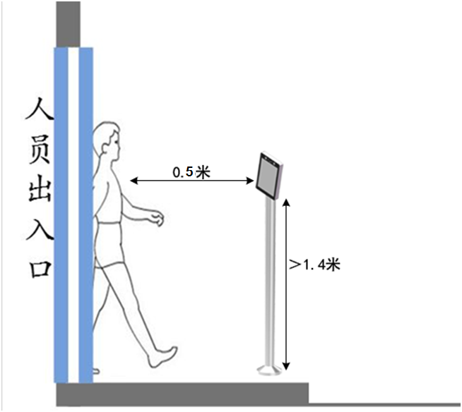 3、為保證體溫檢測(cè)效果,設(shè)備在人員采集點(diǎn)的距離 0.4米為佳(范圍在0.3~0.5米),且人臉像素不小于 100像素;