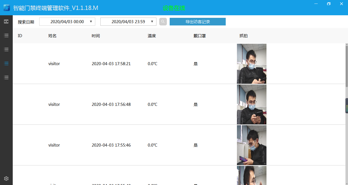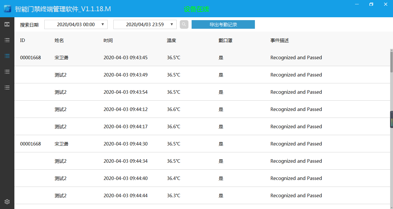 【日志查看】:查看、導(dǎo)出設(shè)備保存的人臉識(shí)別記錄信息,并生成人員考勤記錄表。