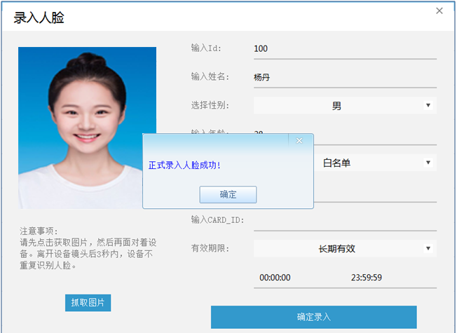 ?點(diǎn)擊【添加】按鈕,進(jìn)入界面è人臉正對(duì)攝像頭è點(diǎn)擊【抓取圖片】按鈕,抓取人臉圖片è輸入人員資料,點(diǎn)擊【確定錄入】按鈕è提示正式錄入人臉成功完成。