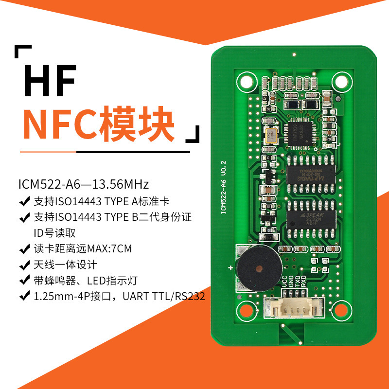 NFC-B6讀寫模塊采用13.56MHZ 非接觸射頻技術,內嵌高集成讀寫芯片作為射頻基站。用戶只需通過簡單的指令發送命令就可以實現對卡片完全的操作。該系列讀寫模塊支持MF1:S50、S70、FM11RF08;MF0: Ultralight、Ultralight C、NTAG203、NTAG213;CPU: FM1208及其兼容卡片, 讀取二代身份證ID。NFCM-A6模塊軟件、硬件擴展功能很強,可根據用戶要求定制個性化模塊。