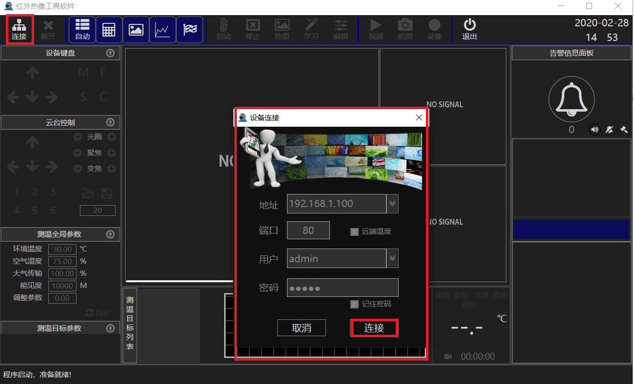 安裝好設(shè)備后,接通電源給設(shè)備上電,設(shè)備使用DC12V電源,用網(wǎng)絡(luò)和電腦連接,如果設(shè)備帶前端測(cè)溫功能(參數(shù)配置還需要測(cè)溫軟件配置),則可以連接到監(jiān)視器監(jiān)控。在電腦上打開(kāi)測(cè)溫軟件,連接設(shè)備,默認(rèn)IP地址為192.168.1.100。注意電腦IP地址需要在同一個(gè)網(wǎng)段。