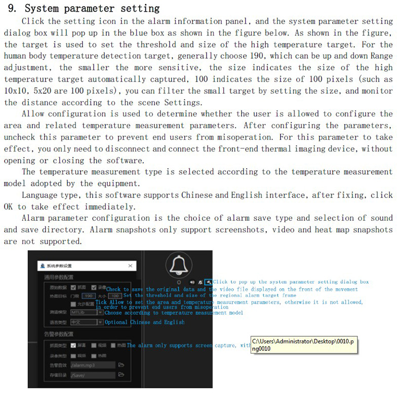告警參數(shù)配置是報(bào)警保存類型的選擇及聲音和保存目錄的選擇。報(bào)警抓圖只支持屏幕截圖,錄像和熱圖抓拍不支持。