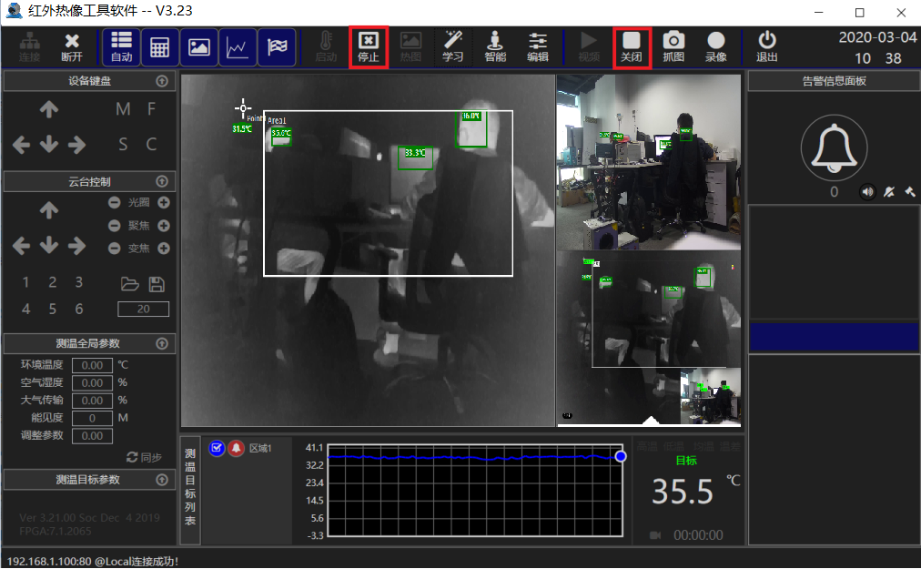 博奧智能熱像儀通過(guò)網(wǎng)絡(luò)連接PC,PC端安裝軟件,該軟件可以連接熱像視頻,可以顯示最高溫,中心點(diǎn)溫度;可以設(shè)置區(qū)域,自動(dòng)追蹤人員并顯示溫度,可配置超溫報(bào)警,實(shí)現(xiàn)報(bào)警抓拍功能,支持通過(guò)AV視頻接口連接大屏顯示器。