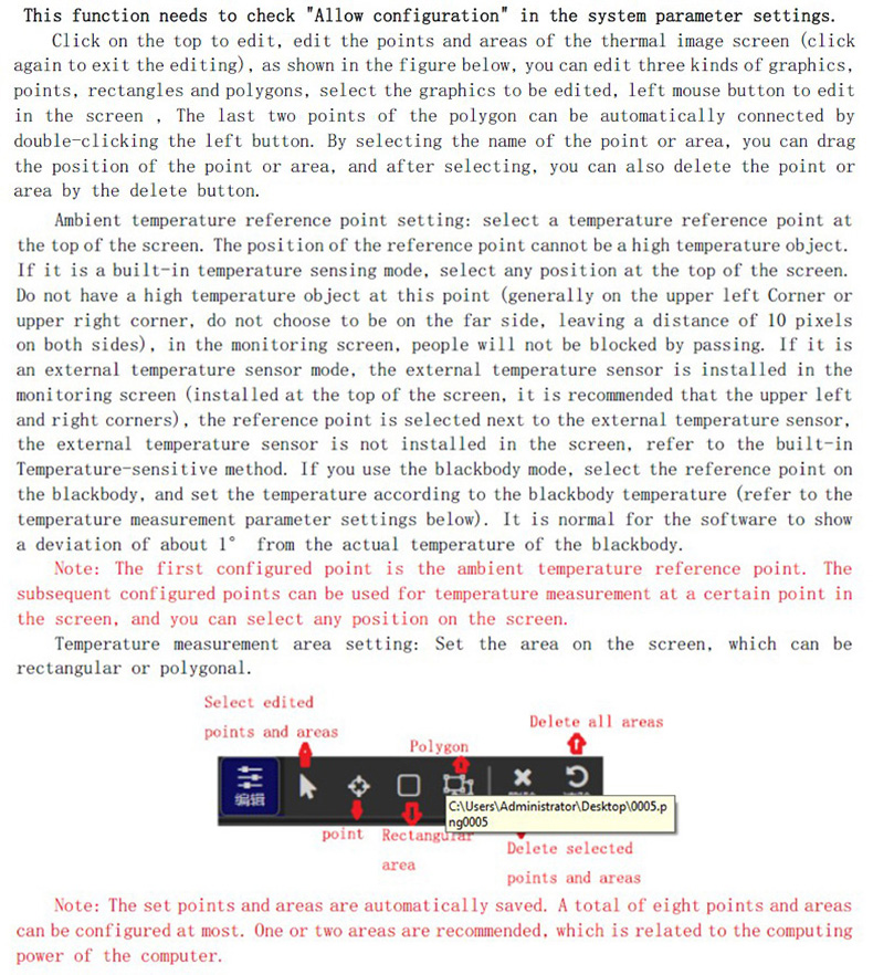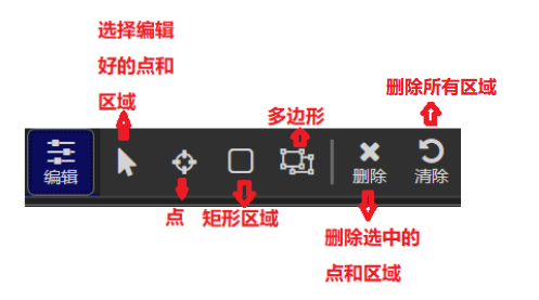 點(diǎn)擊上方編輯,編輯熱像畫(huà)面的點(diǎn)和區(qū)域(再次點(diǎn)擊編輯退出編輯),如下圖,可以編輯三種圖形,點(diǎn)、矩形和多邊形,選擇需要編輯的圖形,鼠標(biāo)左鍵在畫(huà)面中編輯即可,多邊形最后兩點(diǎn)通過(guò)雙擊左鍵可以自動(dòng)連接。通過(guò)選中點(diǎn)或區(qū)域名稱,可以拖動(dòng)點(diǎn)或區(qū)域位置,選中后也可通過(guò)刪除按鈕刪除點(diǎn)或區(qū)域。