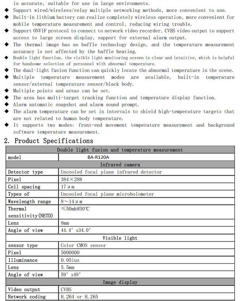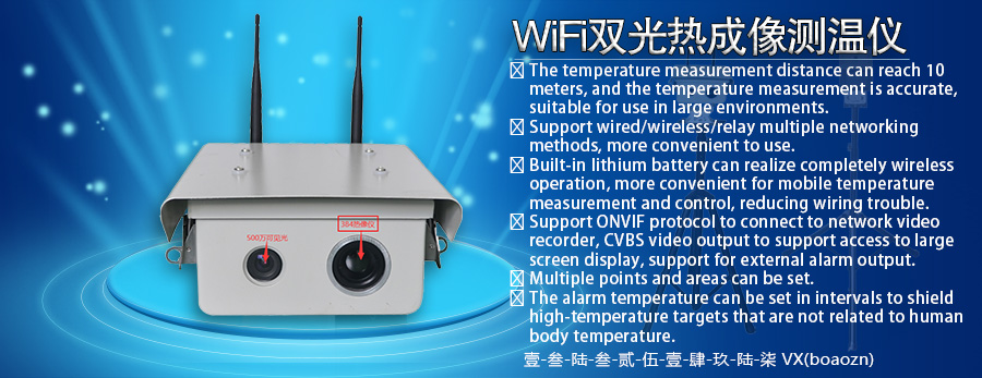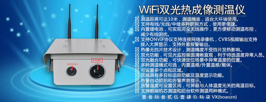無(wú)線雙光融合人體高精度測(cè)溫儀,具有雙光融合功能,可快速準(zhǔn)確地分辨溫度異常人員,可輸出無(wú)線/有線網(wǎng)絡(luò)信號(hào),配合后臺(tái)PC測(cè)溫軟件,可實(shí)現(xiàn)非接觸快速大流量人體溫度異常篩選功能,采用最新智能測(cè)溫模型,無(wú)擋片成像方式,可以連續(xù)不間斷對(duì)目標(biāo)人群進(jìn)行溫度檢測(cè),測(cè)溫精度可達(dá)±0.3°(配置黑體可達(dá)±0.1°-0.3°)。