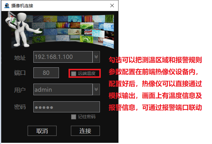 本軟件支持接入具有前端測(cè)溫功能的我司熱像產(chǎn)品,登入設(shè)備的時(shí)候勾選遠(yuǎn)端測(cè)溫即可(需要前端熱像儀支持此功能),設(shè)置方法參考上面說(shuō)明,配置成功后熱像可以通過(guò)模擬輸出連接監(jiān)視器監(jiān)控測(cè)溫,監(jiān)控畫(huà)面可顯示配置的區(qū)域及目標(biāo)溫度。產(chǎn)生告警,畫(huà)面右上角會(huì)有報(bào)警圖標(biāo),報(bào)警信號(hào)也可以通過(guò)熱像報(bào)警輸出口外接報(bào)警設(shè)備。