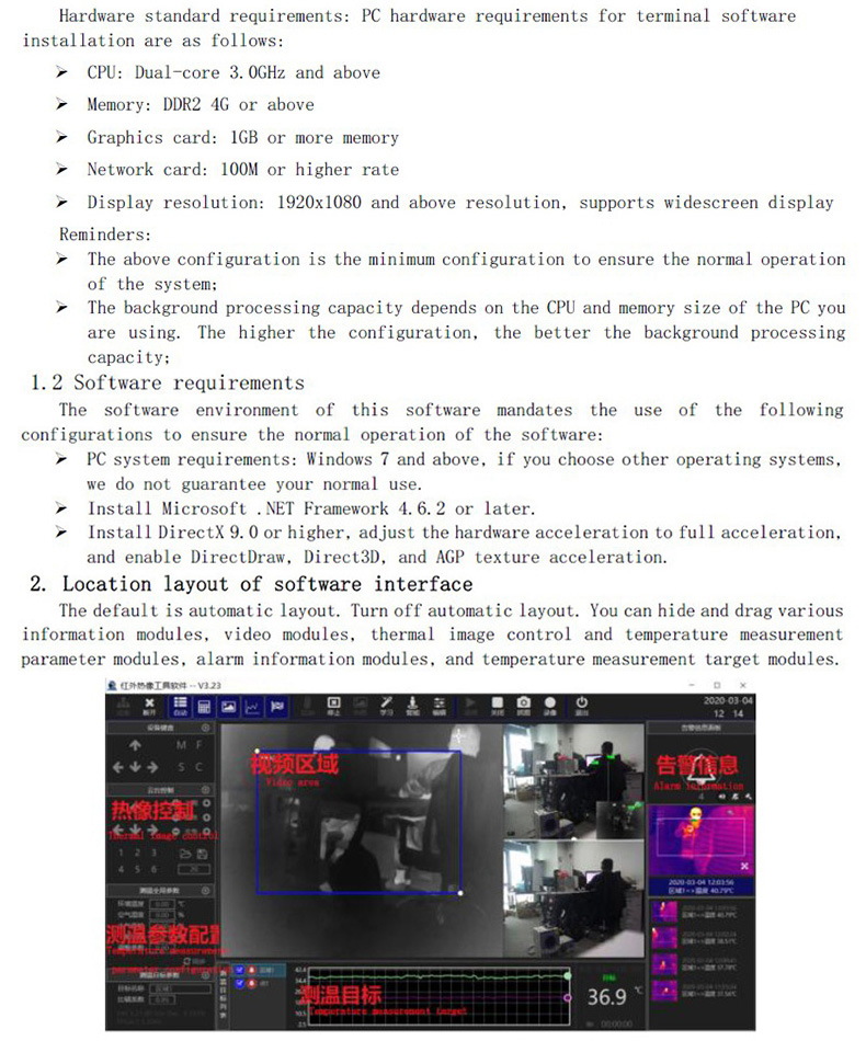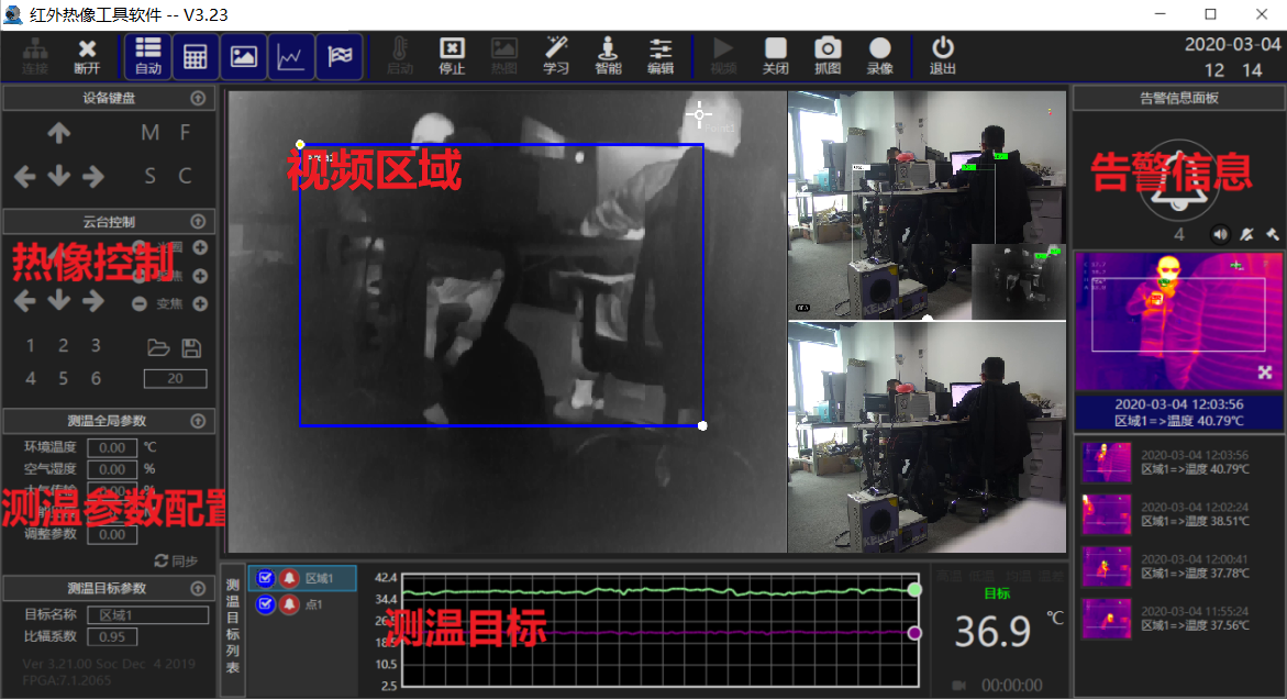 ??? 雙光模組通過(guò)網(wǎng)絡(luò)圖傳連接PC,PC端安裝測(cè)溫軟件,該軟件可以連接熱像和可見(jiàn)光視頻,可以設(shè)置點(diǎn)和區(qū)域測(cè)溫,區(qū)域內(nèi)可自動(dòng)追蹤人員并顯示溫度,可配置超溫報(bào)警,實(shí)現(xiàn)報(bào)警抓拍功能。