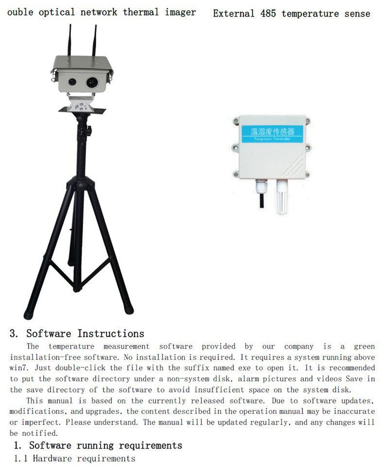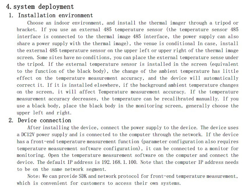 選擇一個(gè)室內(nèi)壞境,通過(guò)三腳架或支架固定安裝熱像儀,如果使用外置485溫感(溫感485接口和熱像的485接口連接,供電也可以和熱像共用一個(gè)電源),場(chǎng)地有條件情況下,把外置485溫感安裝在熱像畫(huà)面的左上方或右上方。有些場(chǎng)地沒(méi)有條件,可以把外置溫感放置在三角架下。如果外置溫感安裝在畫(huà)面中(等同于黑體的作用),環(huán)境溫度的變化對(duì)測(cè)溫精度度影響很小,設(shè)備會(huì)自動(dòng)校正,如果安裝在別處,畫(huà)面中背景環(huán)境溫度變化的話,會(huì)影響測(cè)溫精度,如果測(cè)溫精度下降,可手動(dòng)重新校正溫度。如果使用黑體,把黑體放置在監(jiān)控畫(huà)面中,一般選左右上方。