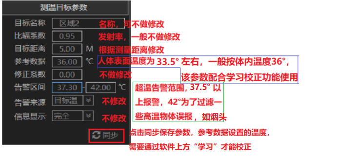 開(kāi)啟測(cè)溫功能后,才能進(jìn)行溫度校正學(xué)習(xí),讓一個(gè)正常體溫的人(必須是同一個(gè)人)在區(qū)域各個(gè)位置移動(dòng)(主要是人臉在區(qū)域各個(gè)位置移動(dòng),額頭對(duì)著熱像鏡頭),移動(dòng)前點(diǎn)擊軟件上方學(xué)習(xí)按鈕(圖標(biāo)轉(zhuǎn)動(dòng)的時(shí)候表示學(xué)習(xí)功能啟動(dòng)),當(dāng)移動(dòng)完成所有位置時(shí),再次點(diǎn)擊學(xué)習(xí)關(guān)閉學(xué)習(xí)狀態(tài),完成校正。校正溫度設(shè)置在測(cè)溫目標(biāo)參數(shù)設(shè)置里的“參考數(shù)據(jù)"選項(xiàng)配置,修改好參考數(shù)據(jù)的溫度數(shù)據(jù),需要點(diǎn)擊“同步”,每個(gè)區(qū)域單獨(dú)設(shè)置。