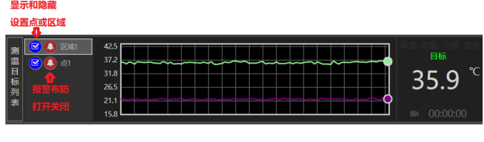 軟件具有告警布防功能,默認(rèn)打開(kāi),在軟件下方測(cè)溫目標(biāo)列表,可以配置設(shè)置的區(qū)域的布防開(kāi)關(guān),還可以顯示和隱藏?zé)嵯褚曨l中設(shè)置的測(cè)溫點(diǎn)和區(qū)域。選中某個(gè)區(qū)域,下方可顯示該區(qū)域的最高溫及統(tǒng)計(jì)曲線。