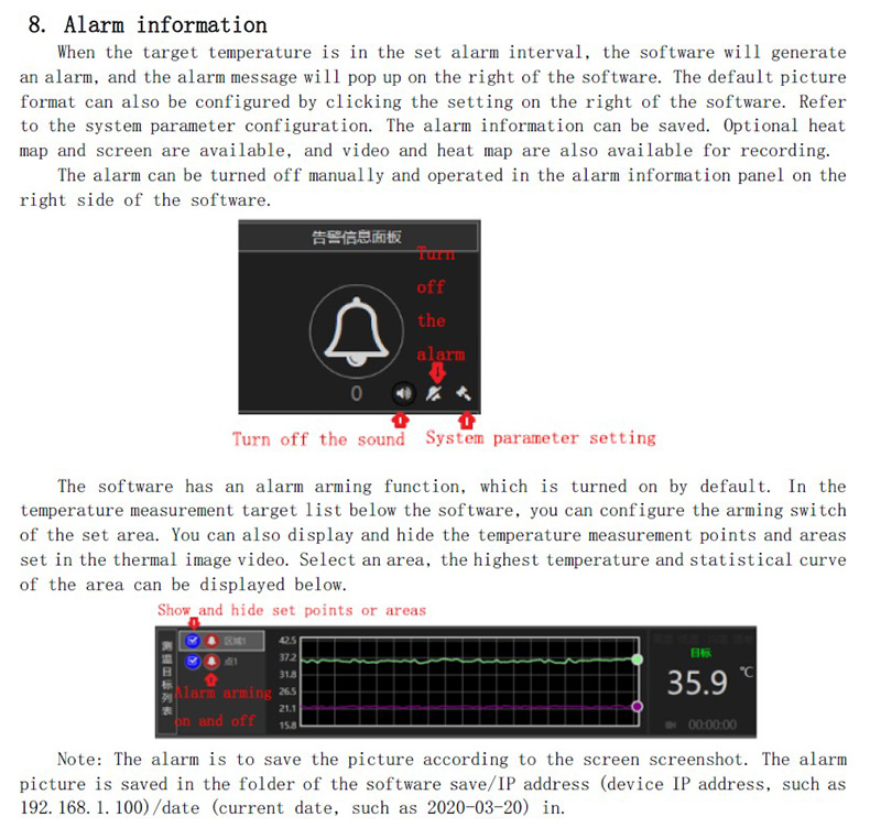 注:報(bào)警是按屏幕截屏的方式保存圖片的,報(bào)警圖片保存在軟件save/IP地址(設(shè)備IP地址,如:192.168.1.100)/日期(當(dāng)前日期,如:2020-03-20)的文件夾里。