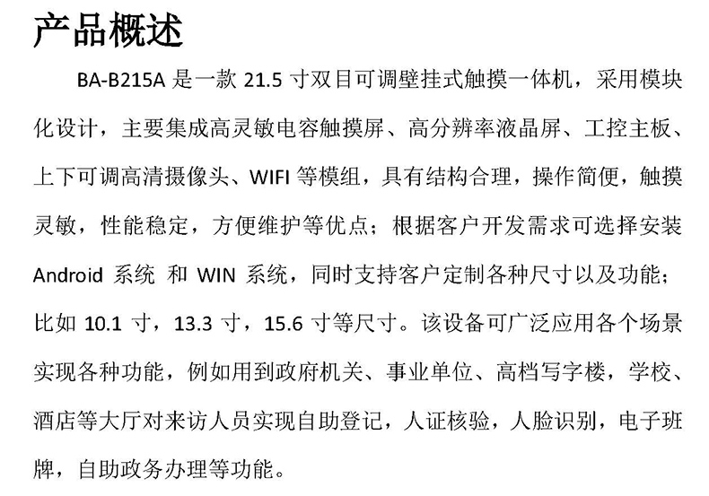 BA-B215A是一款21.5寸雙目可調壁掛式觸摸一體機,采用模塊化設計,主要集成高靈敏電容觸摸屏、高分辨率液晶屏、工控主板、上下可調高清攝像頭、WIFI等模組,具有結構合理,操作簡便,觸摸靈敏,性能穩定,方便維護等優點;根據客戶開發需求可選擇安裝Android系統 和WIN系統,同時支持客戶定制各種尺寸以及功能;比如10.1寸,13.3寸,15.6寸等尺寸。該設備可廣泛應用各個場景實現各種功能,例如用到政府機關、事業單位、高檔寫字樓,學校、酒店等大廳對來訪人員實現自助登記,人證核驗,人臉識別,電子班牌,自助政務辦理等功能。