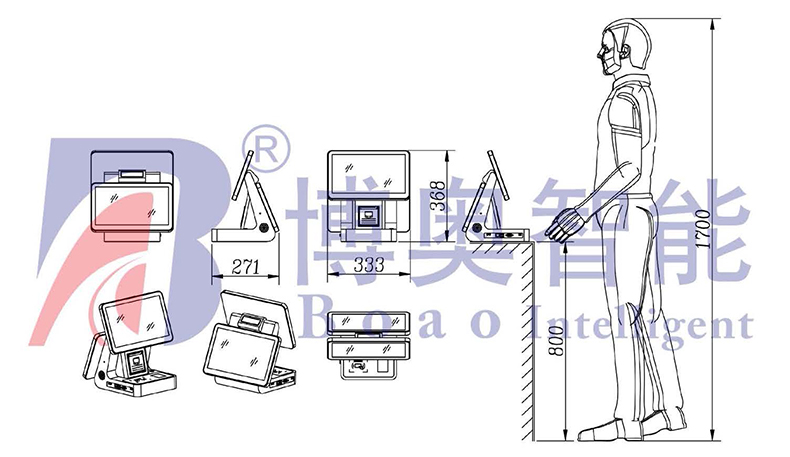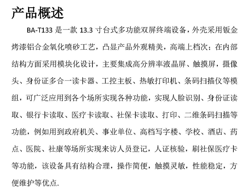 BA-T133是一款13.3寸臺式多功能雙屏終端設備,外殼采用鈑金烤漆鋁合金氧化噴砂工藝,凸顯產品外觀精美,高端上檔次;在內部結構方面采用模塊化設計,主要集成高分辨率液晶屏、觸摸屏,攝像頭、身份證多合一讀卡器、工控主板、熱敏打印機、條碼掃描儀等模組,可廣泛應用到各個場所實現各種功能,實現人臉識別、身份證讀取、銀行卡讀取、醫療卡讀取、社??ㄗx取、打印、二維條碼掃描等功能,例如用到政府機關、事業單位、高檔寫字樓、學校、酒店、藥點、醫院、社康等場所實現來訪人員登記,人證核驗,刷社保醫療卡等功能,該設備具有結構合理,操作簡便,觸摸靈敏,性能穩定,方便維護等優點.