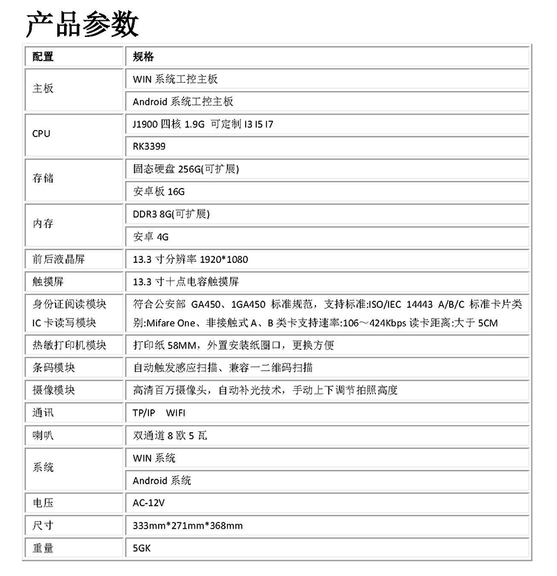 功 能:臉識別、身份證讀取、銀行卡讀取、醫療卡讀取、社??ㄗx取、打印、二維條碼掃描