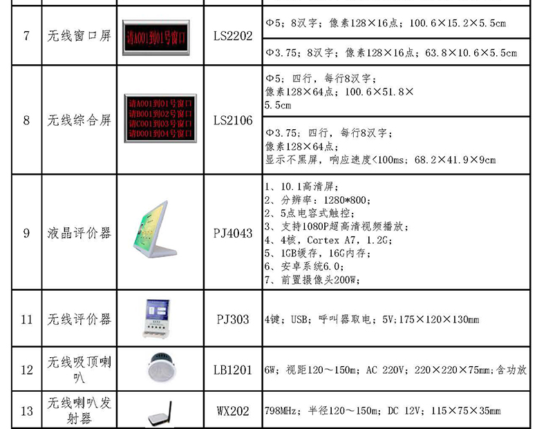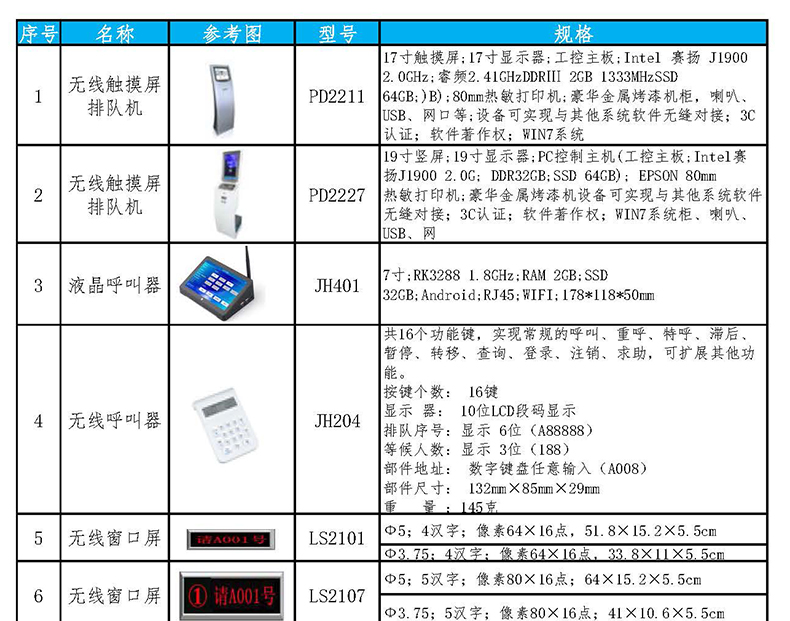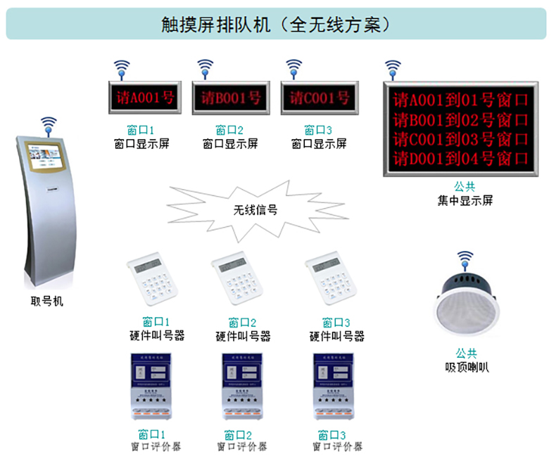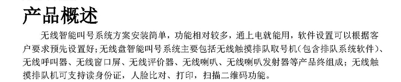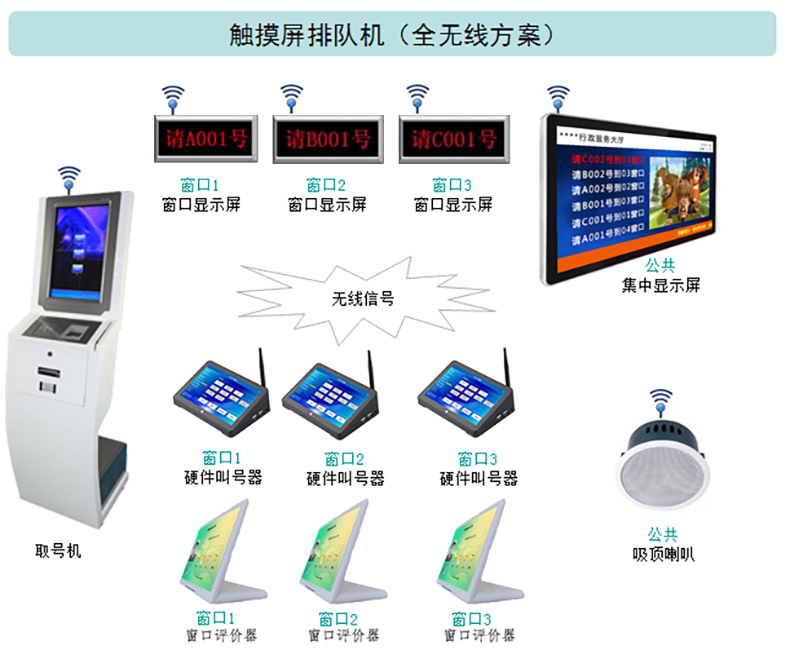 無線智能叫號系統方案安裝簡單,功能相對較多,通上電就能用,軟件設置可以根據客戶要求預先設置好;無線盤智能叫號系統主要包括無線觸摸排隊取號機(包含排隊系統軟件)、無線呼叫器、無線窗口屏、無線評價器、無線喇叭、無線喇叭發射器等產品終組成;無線觸摸排隊機可支持讀身份證,人臉比對、打印,掃描二維碼功能。