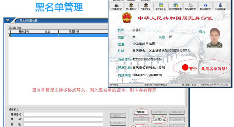 軟件提供黑名單功能,在讀卡時若為黑名單則顯示黑名單的報警提示,在刷卡流水查詢時有黑名單標志顯示。