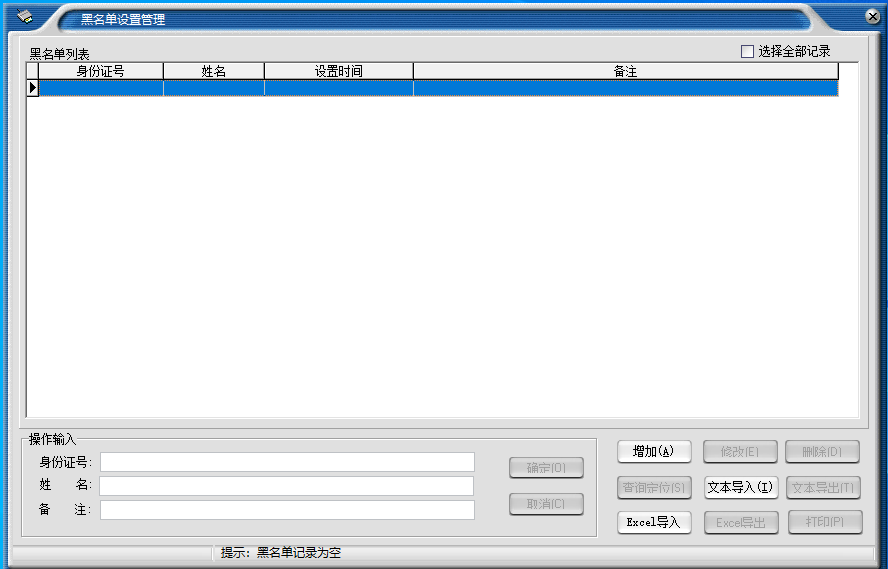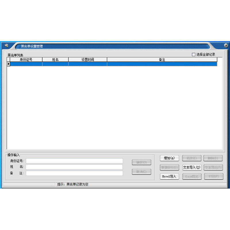 按身份證號、姓名設置黑名單信息,還可以在備注信息中填寫關于黑名單的附加信息。黑名單的設置可以在黑名單維護窗體中進行,也可以在刷卡流水查詢窗體,點擊“置黑名單”按鈕設置。