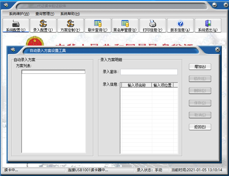 所謂自動錄入就是讀取二代證信息時,在信息顯示的同時,自動把方案所定義的信息錄入到相關應用程序的指定窗體中。