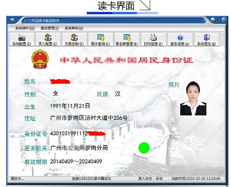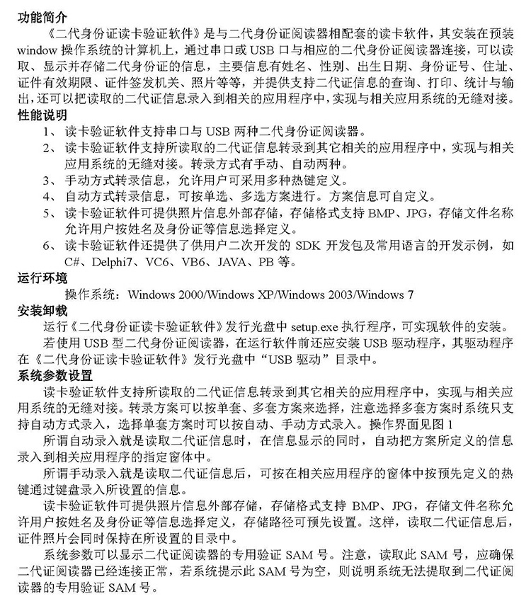 《二代身份證讀卡驗證軟件》是與二代身份證閱讀器相配套的讀卡軟件,其安裝在預裝window操作系統的計算機上,通過串口或USB口與相應的二代身份證閱讀器連接,可以讀取、顯示并存儲二代身份證的信息,主要信息有姓名、性別、出生日期、身份證號、住址、證件有效期限、證件簽發機關、照片等等,并提供支持二代證信息的查詢、打印、統計與輸出,還可以把讀取的二代證信息錄入到相關的應用程序中,實現與相關應用系統的無縫對接。