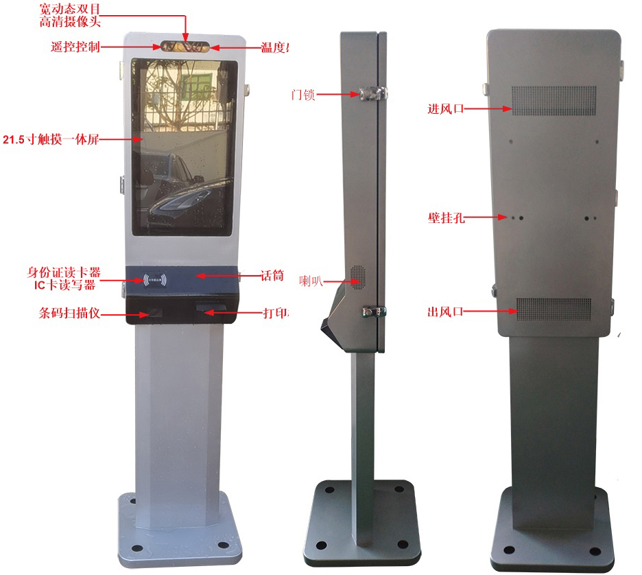 21.5寸室外多功能戶(hù)外一體機(jī)安裝方式支持壁掛和落地(立式)兩種方式,集成21.5寸高清液晶屏和室外專(zhuān)用電容觸摸屏;寬動(dòng)態(tài)雙目攝像頭 ;身份證和IC卡讀卡器;熱敏打印機(jī);條碼掃描,RK3399工業(yè)主板等模塊。