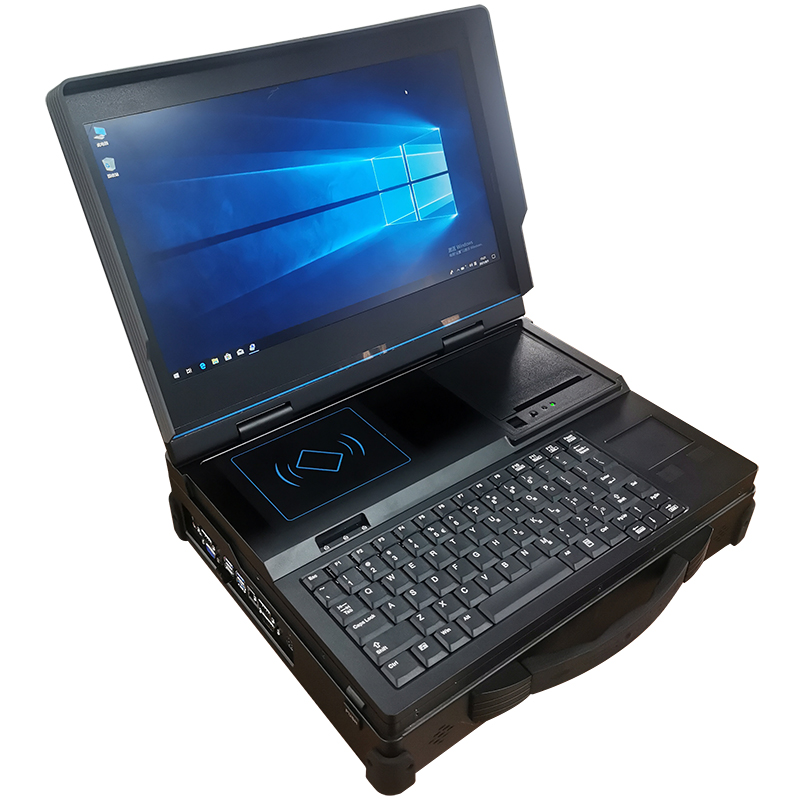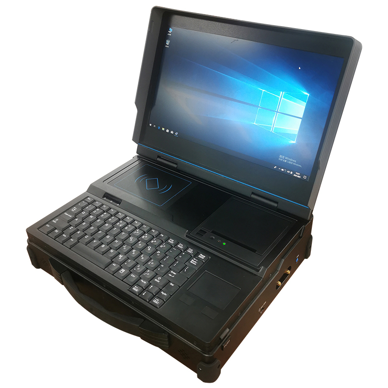 15.6寸便攜式工控計算機采用低能耗工業主板,4G內存256G固態硬盤,集成多功能讀卡器(身份證讀取 IC卡讀寫 銀行卡讀取)、80mm熱敏打印機、無線WIFI、4G等功能;機殼采用高強度鋁鎂合金結構、表面采用防刮涂層處理,全方位的防震動橡膠墊和機箱內部結構之間的防震技術,使便攜式工業電腦具有極強的抗震性能,能夠在較惡劣的環境下滿足客戶的各種程度的測試和工作需求;產品具有功能強大、性能穩定、操作簡單、便攜、加固、 輕便、擴展性強等特點;博奧智能可根據客戶需求定制開發各種非標便攜式筆記本電腦及整合各類功能模塊,定制包括功能、外觀、功能配置等服務。