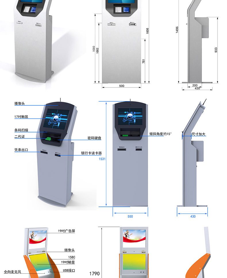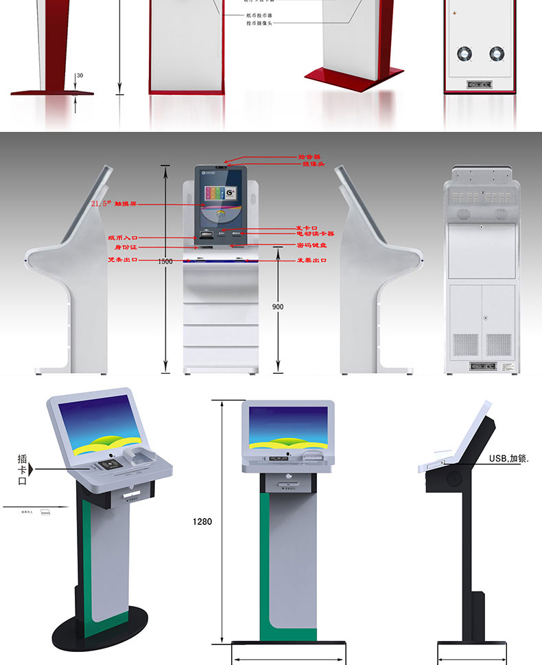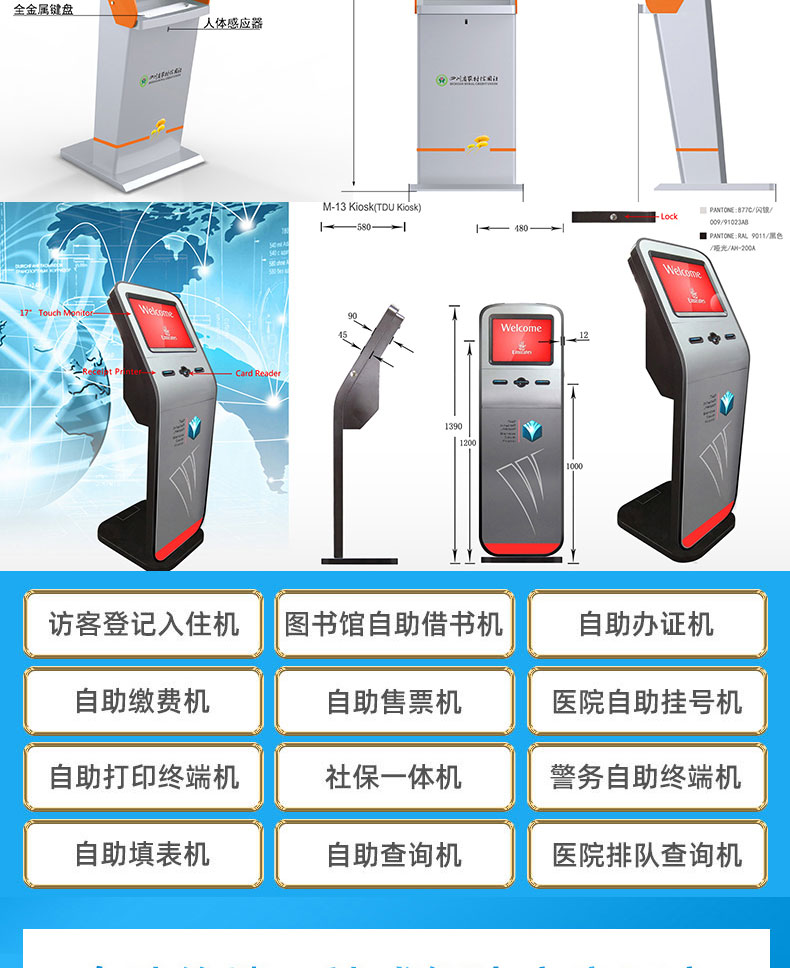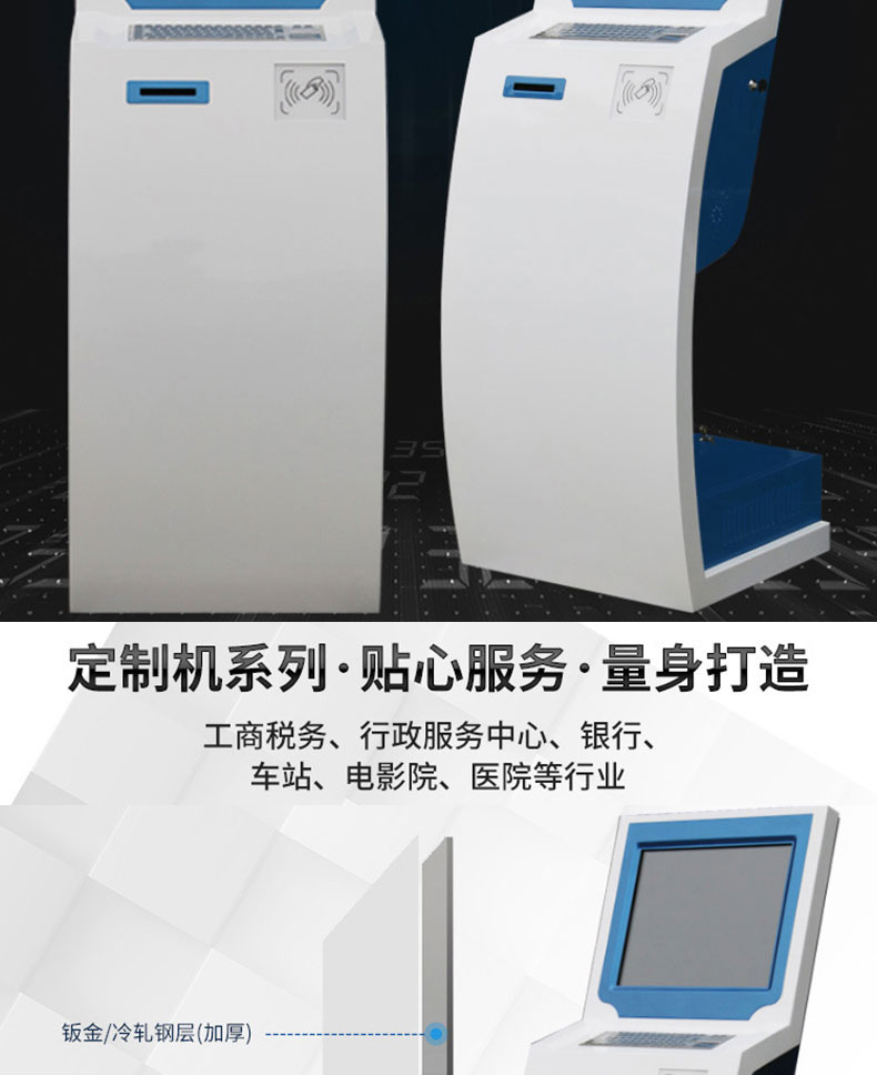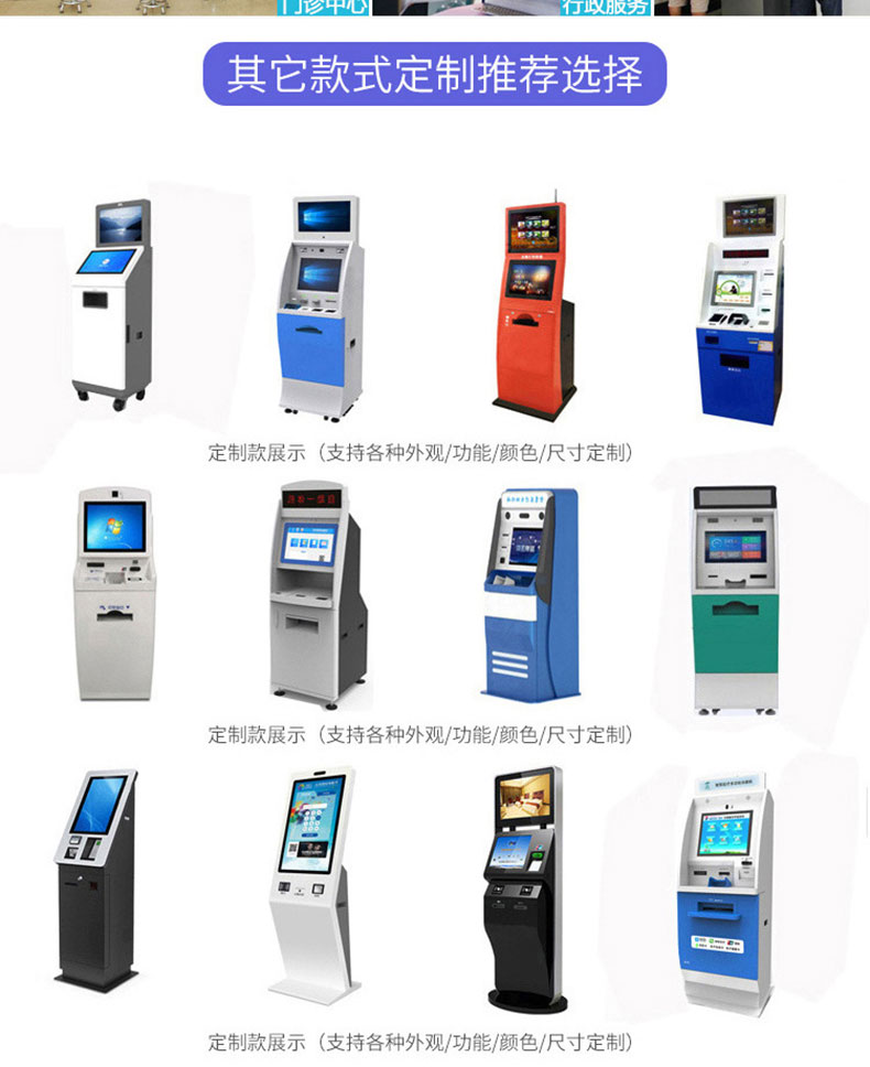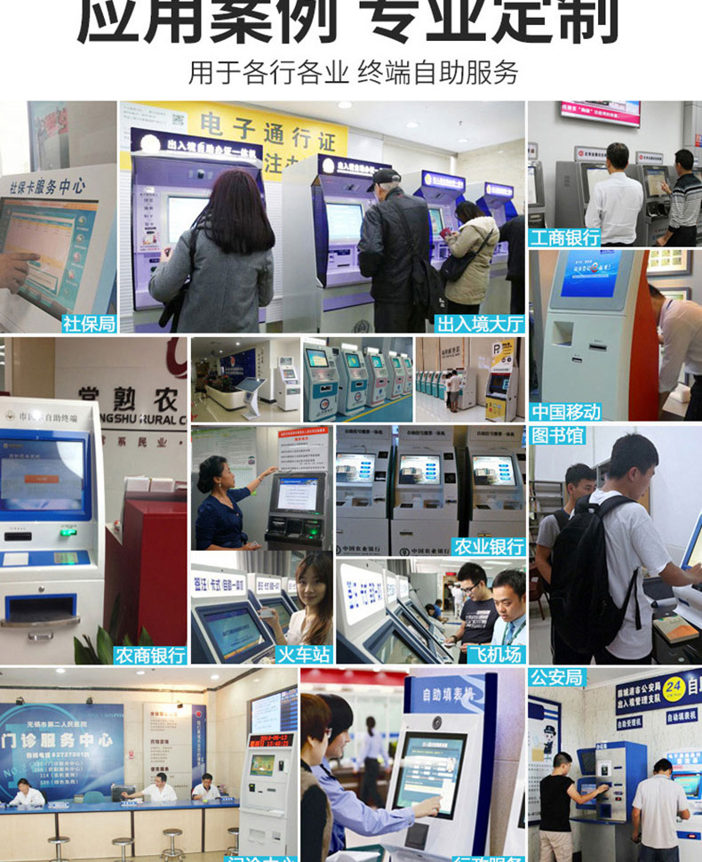 自助終端機定制:定制各種場景各種款式非標終端機;例如訪客機、景區自助取票機、醫院繳費查詢機、醫院自助取單機、社保查詢機、室內外廣告機、排隊叫號機、工控一體機、電力繳費查詢機、圖書自助銷售機、便攜式計算機、酒店自助入住機、自助收銀機等終端。