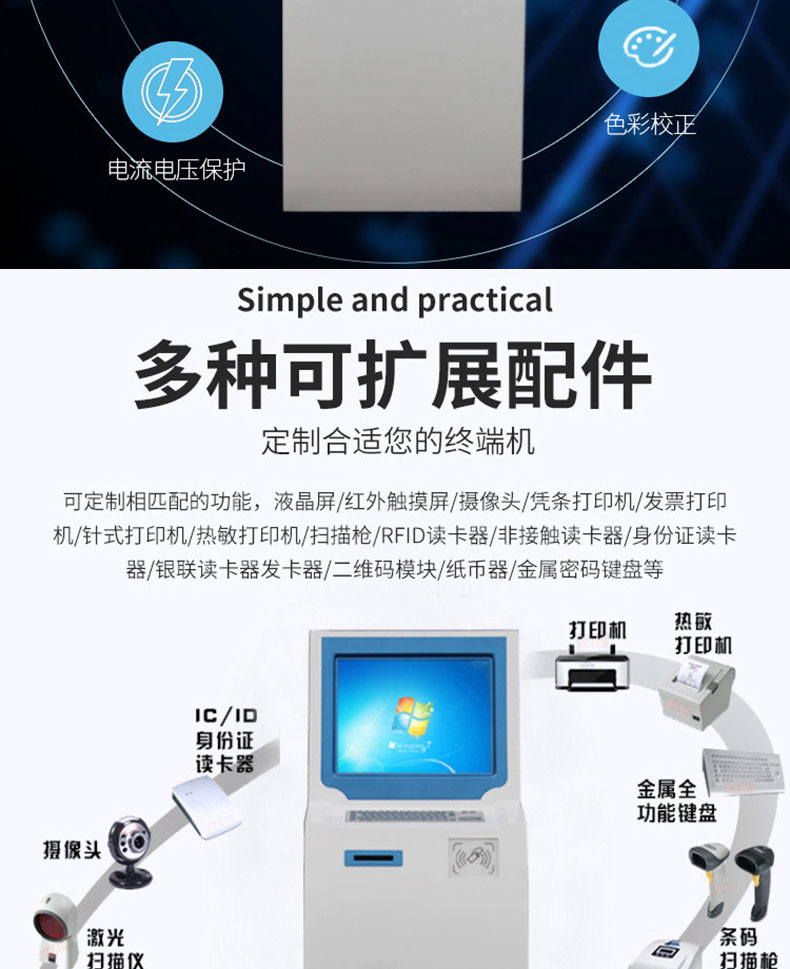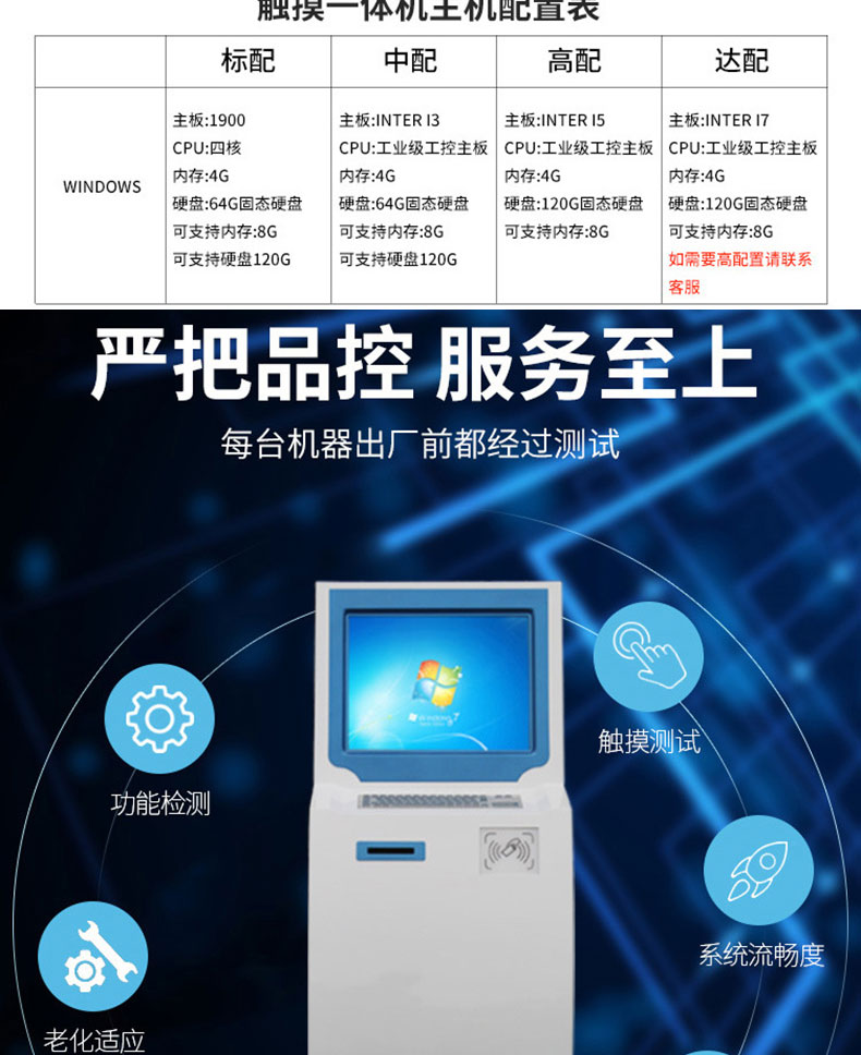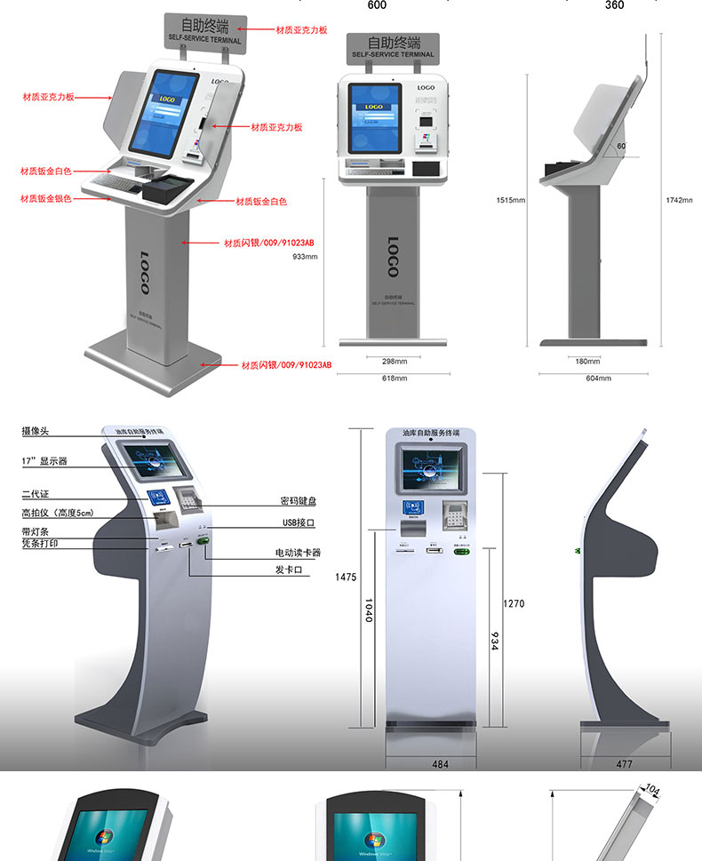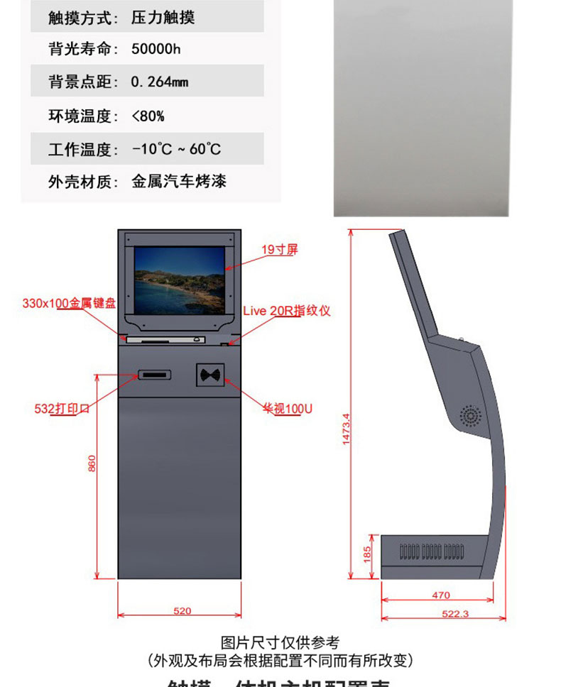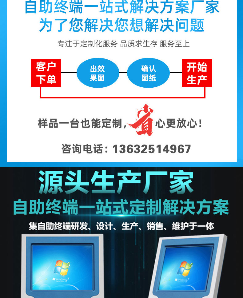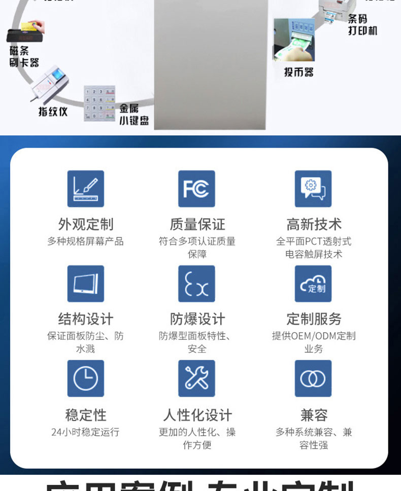 自助終端機定制:定制各種場景各種款式非標終端機;例如訪客機、景區自助取票機、醫院繳費查詢機、醫院自助取單機、社保查詢機、室內外廣告機、排隊叫號機、工控一體機、電力繳費查詢機、圖書自助銷售機、便攜式計算機、酒店自助入住機、自助收銀機等終端。