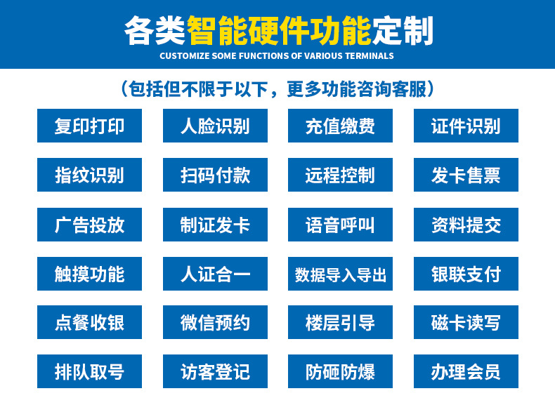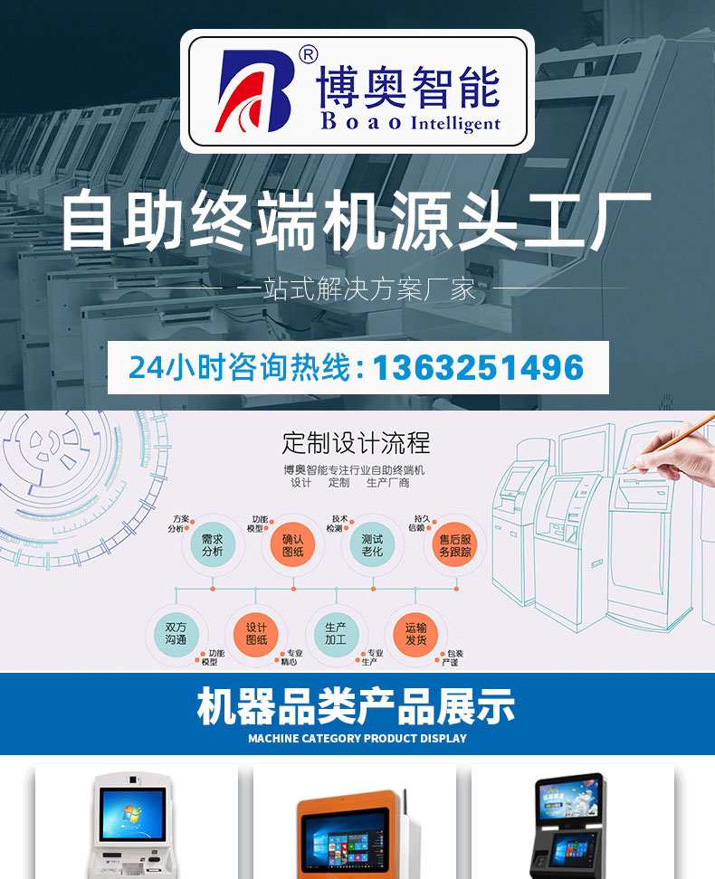 專業(yè)提供電腦觸控產(chǎn)品、自助服務(wù)終端的設(shè)計及生產(chǎn)服務(wù),主要產(chǎn)品自助終端機、自助打印機、自助取票機、自助查詢機、自助繳費機、自助發(fā)卡機、自助政務(wù)一體機,產(chǎn)品使用于各個行業(yè);醫(yī)院、學校、銀行、酒店、景區(qū)等。。。。。公司擁有專業(yè)的生產(chǎn)線,嚴格的質(zhì)量把控。耐心的咨詢服務(wù)團隊及專業(yè)的技術(shù)負責團體。