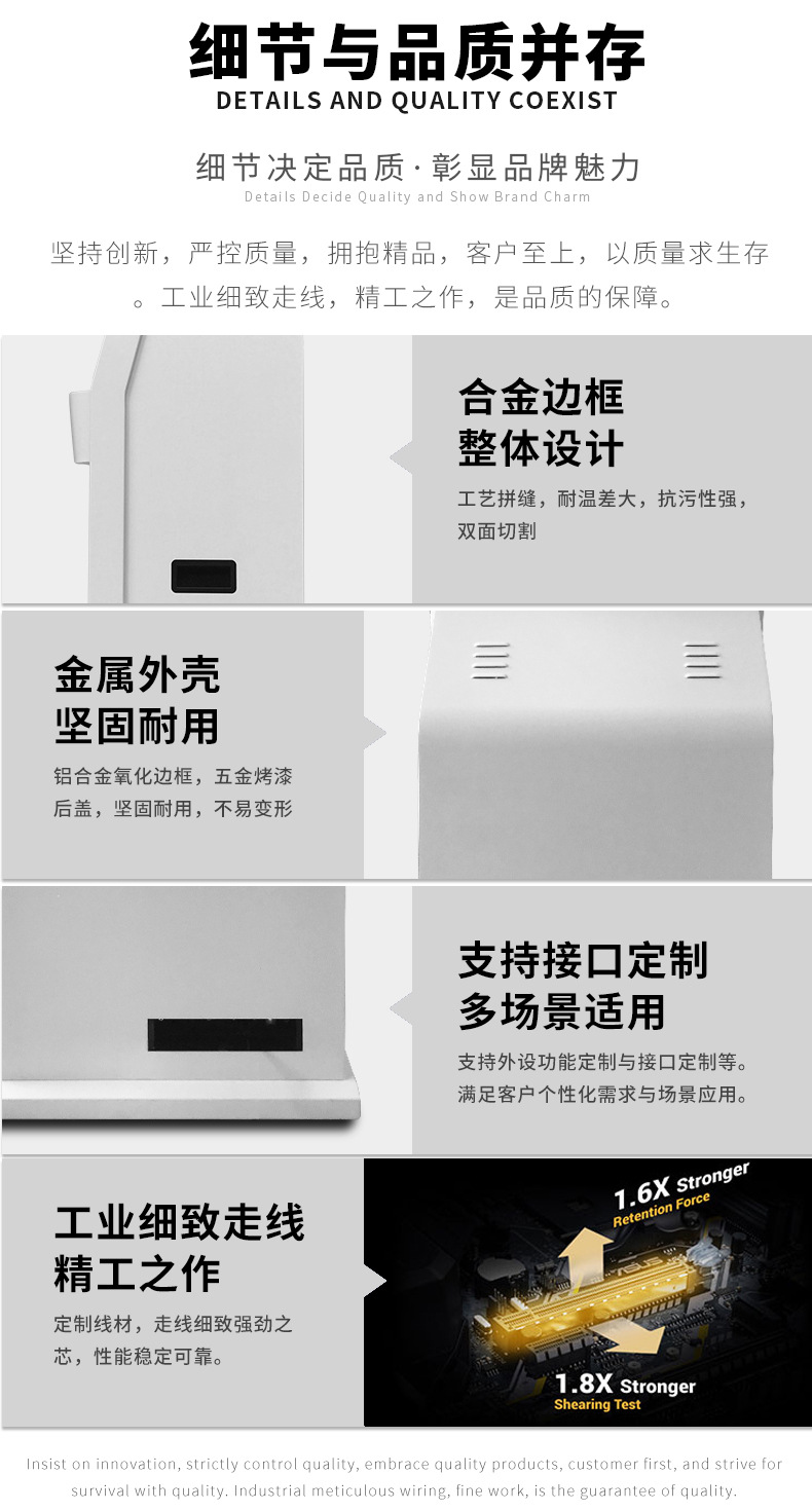 公司成產(chǎn)以“誠信、團結(jié)、務(wù)實、創(chuàng)新”的企業(yè)精神開拓市場、優(yōu)化產(chǎn)品細節(jié)提供舒適的自助體驗。公司本著“誠信為本,質(zhì)量至上”的取勝之道不斷開發(fā)自助終端在各行業(yè)的應(yīng)用,打造方便快捷的一站式服務(wù)。
