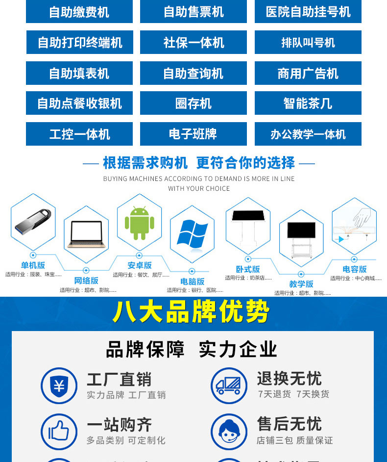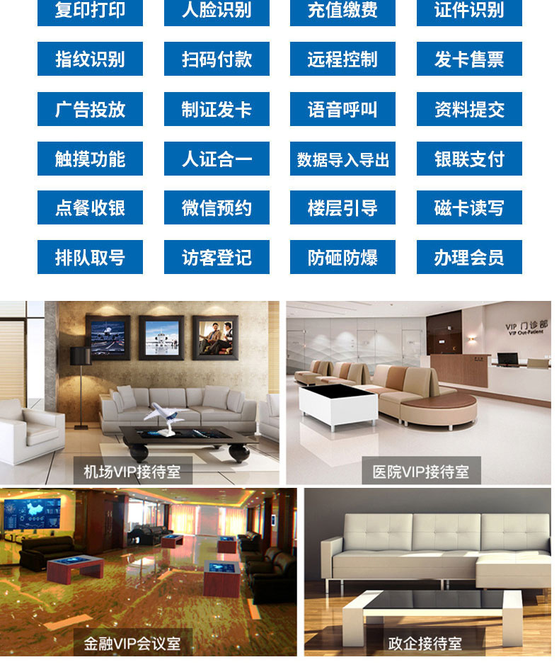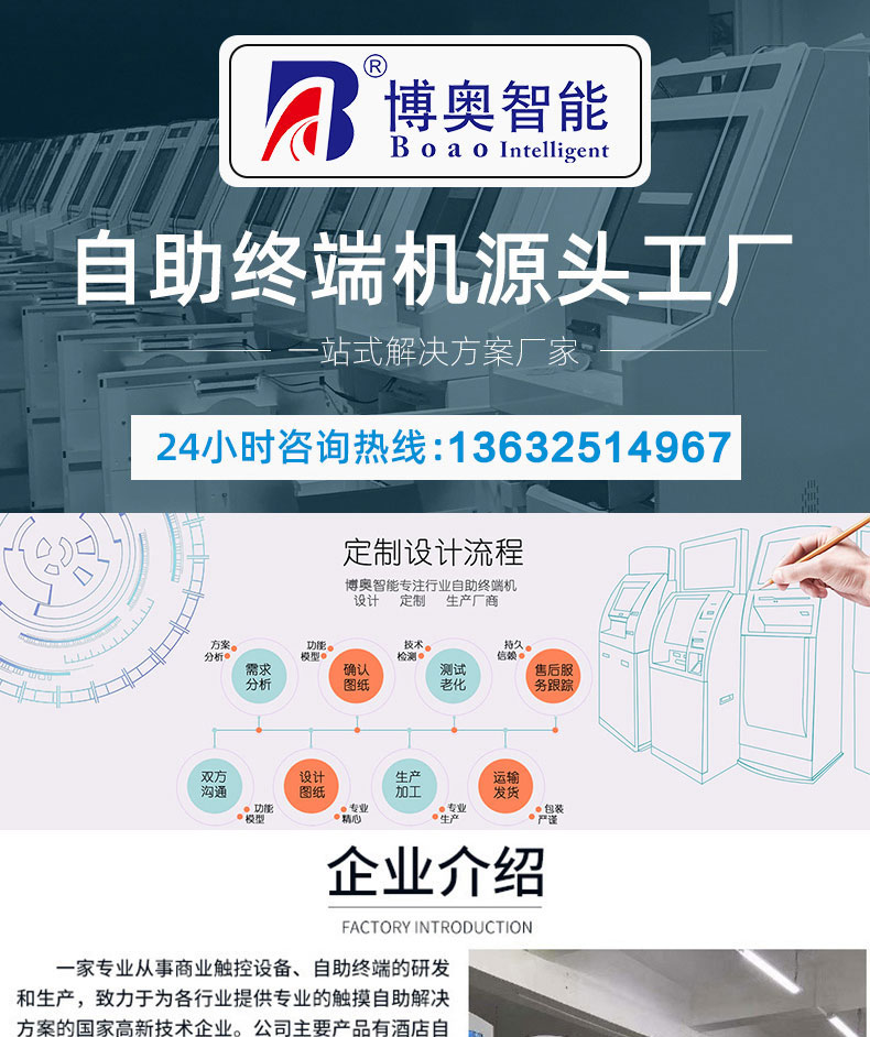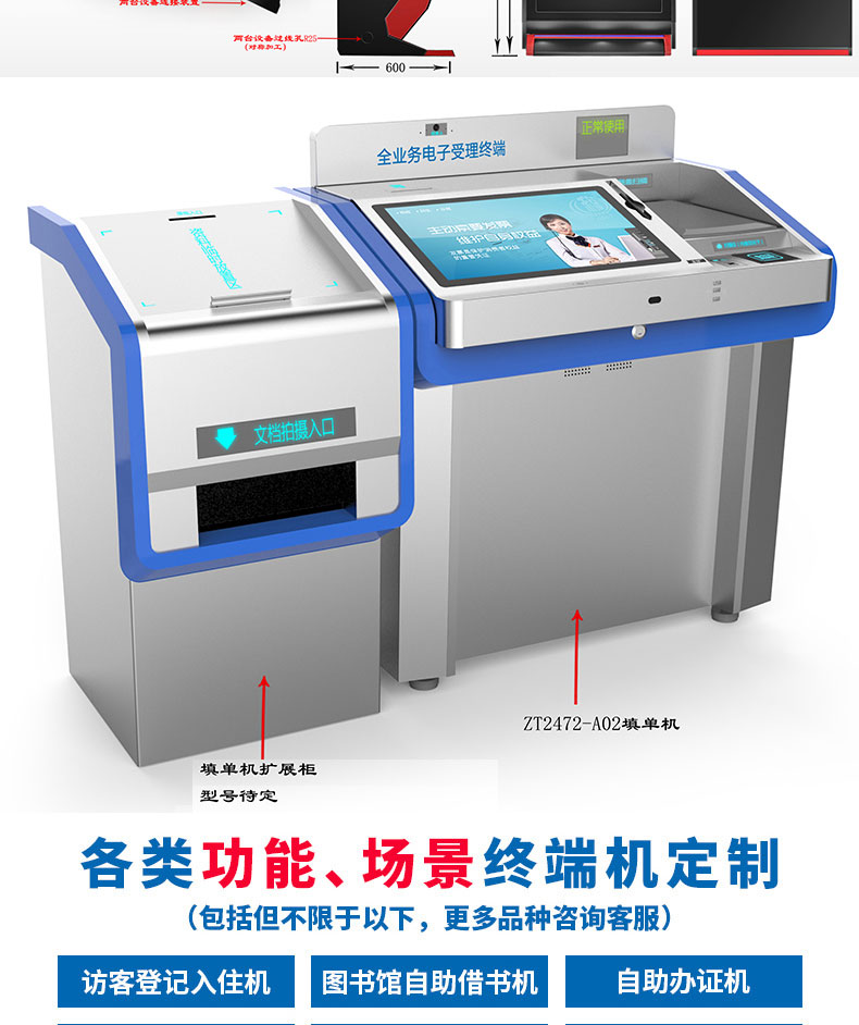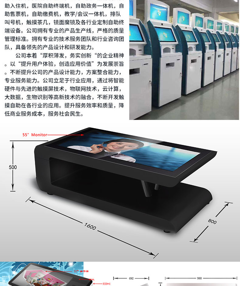 自助終端機定制:定制各種場景各種款式非標終端機;例如訪客機、景區自助取票機、醫院繳費查詢機、醫院自助取單機、社保查詢機、室內外廣告機、排隊叫號機、工控一體機、電力繳費查詢機、圖書自助銷售機、便攜式計算機、酒店自助入住機、自助收銀機等終端。