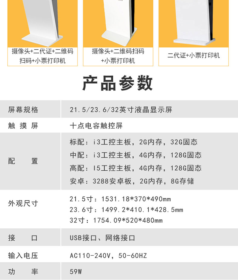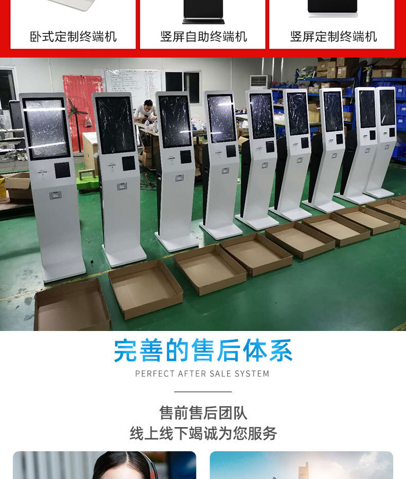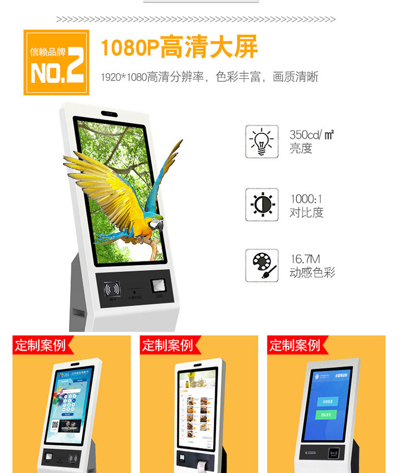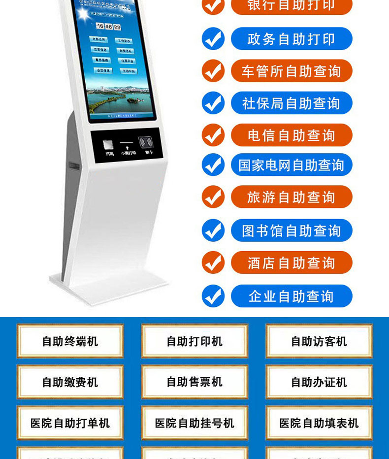 自助終端機定制:定制各種場景各種款式非標終端機;例如訪客機、景區(qū)自助取票機、醫(yī)院繳費查詢機、醫(yī)院自助取單機、社保查詢機、室內(nèi)外廣告機、排隊叫號機、工控一體機、電力繳費查詢機、圖書自助銷售機、便攜式計算機、酒店自助入住機、自助收銀機等終端。