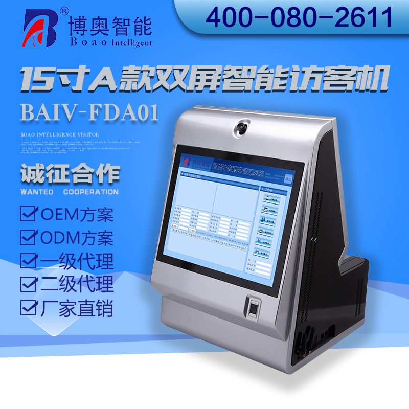 ? ? ? 15寸A款雙屏智能訪客機利用用計算機、觸摸屏手寫、證件識別(OCR),射頻識別、指紋生物識別、熱敏打印、條碼、數(shù)碼攝像、自動制證、硬件加密、網(wǎng)絡等技術(shù)實現(xiàn)智能信息化訪客登記管理,將目前手工填寫出入登記管理、電話咨詢被訪人等傳統(tǒng)方式轉(zhuǎn)變?yōu)楦呖萍嫉挠嬎銠C化、信息數(shù)字化處理,消除了手寫登記填寫時間長,容易出錯,信息缺失虛假多,不易保存,信息查詢困難等種種弊端;訪客登記管理系統(tǒng)能夠準確快速的對來訪人員的證件、圖像、指紋等信息進行識別登記并保存,以便日后查詢,同時利用聯(lián)動功能,可以對進出車輛自動識別登記。