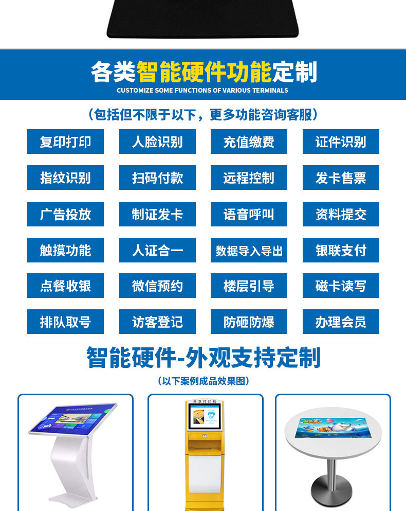 專業提供電腦觸控產品、自助服務終端的設計及生產服務,主要產品自助終端機、自助打印機、自助取票機、自助查詢機、自助繳費機、自助發卡機、自助政務一體機,產品使用于各個行業;醫院、學校、銀行、酒店、景區等。。。。。公司擁有專業的生產線,嚴格的質量把控。耐心的咨詢服務團隊及專業的技術負責團體。