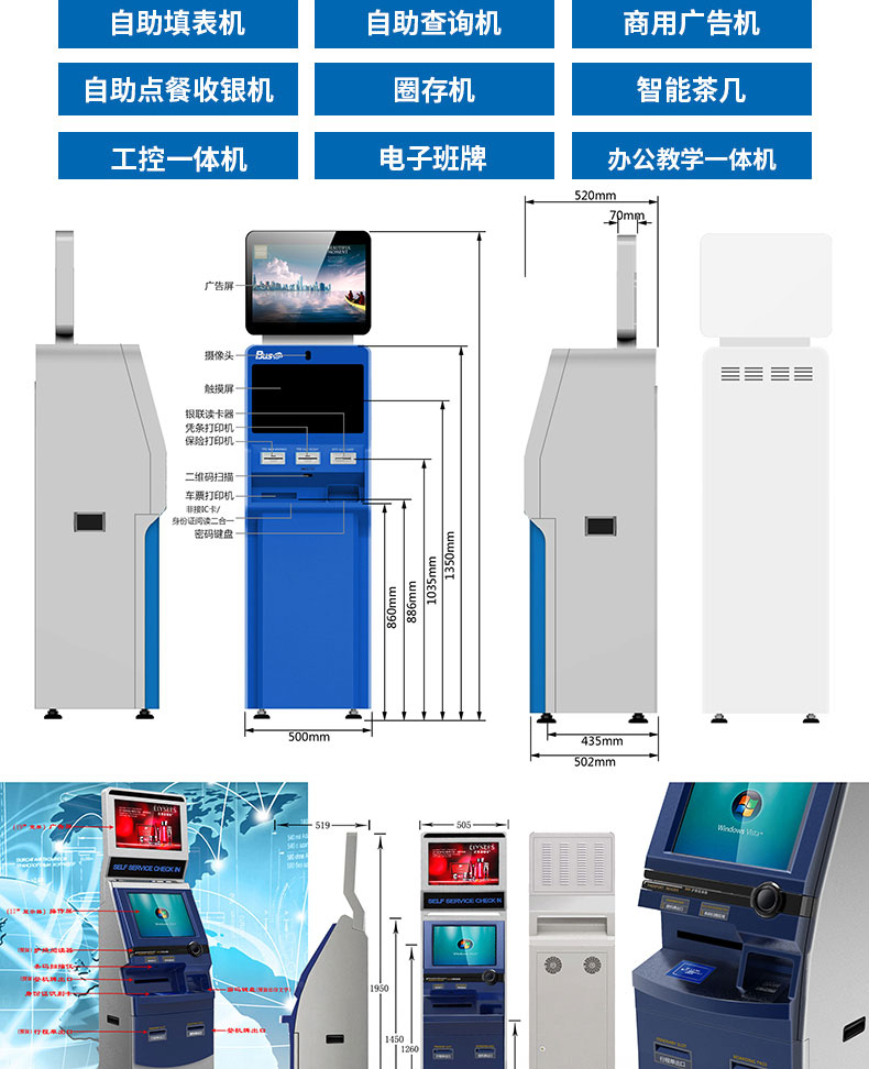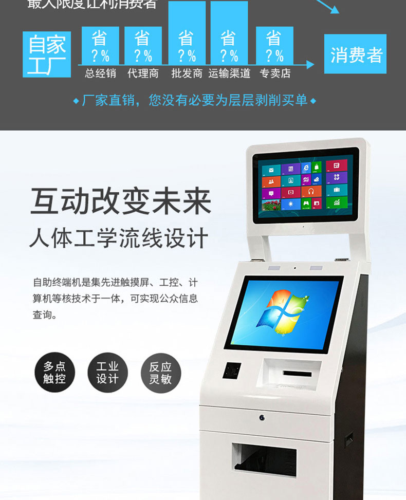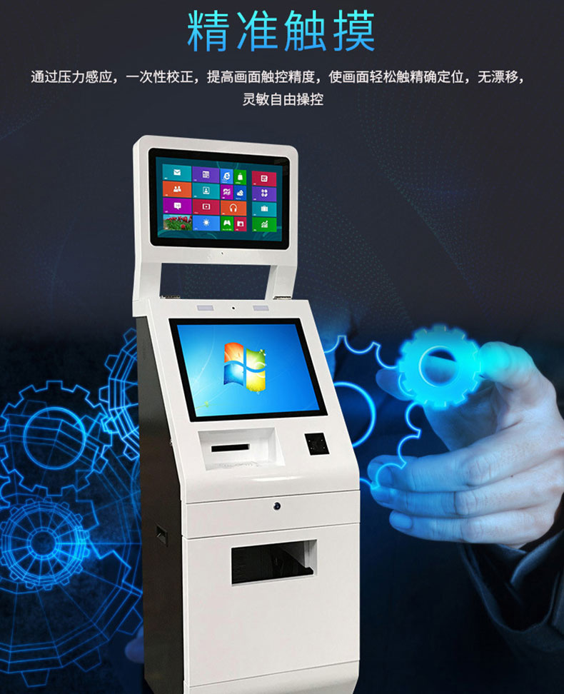 專業提供電腦觸控產品、自助服務終端的設計及生產服務,主要產品自助終端機、自助打印機、自助取票機、自助查詢機、自助繳費機、自助發卡機、自助政務一體機,產品使用于各個行業;醫院、學校、銀行、酒店、景區等。。。。。公司擁有專業的生產線,嚴格的質量把控。耐心的咨詢服務團隊及專業的技術負責團體。