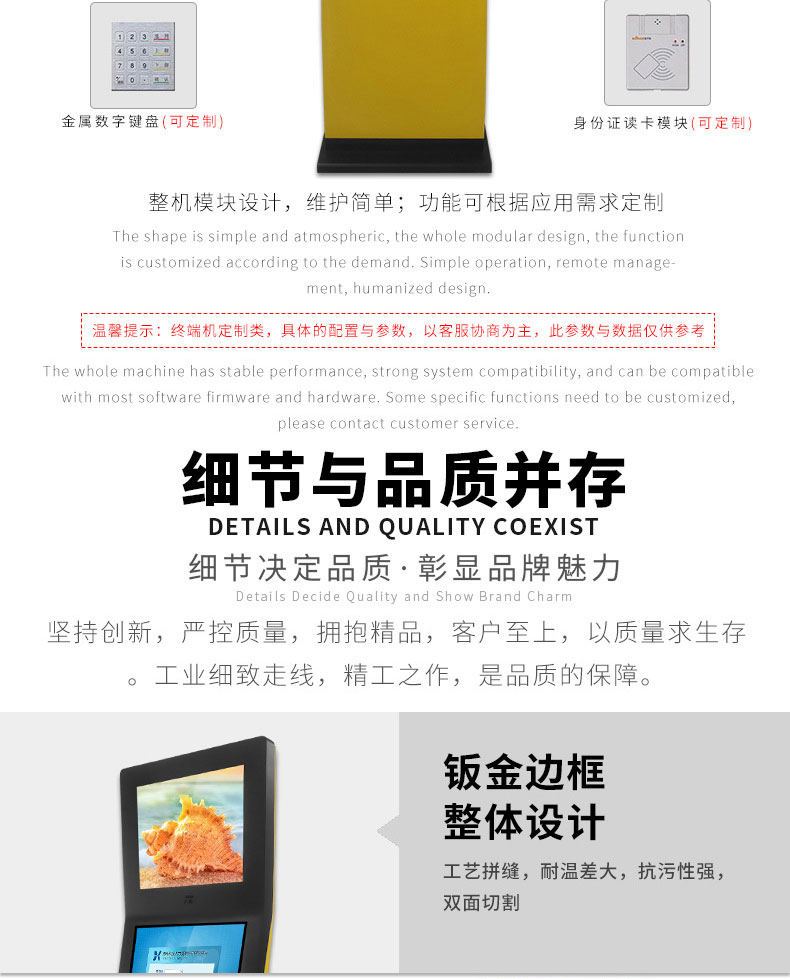 定制實用的自助終端設備,我們是專業。多種定制款式任意選擇,可根據需求定制外觀屏幕尺寸可選,配件數量可選,主機配置可選。
