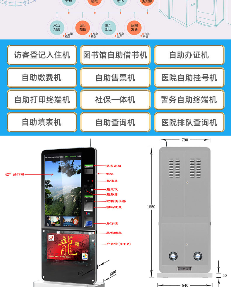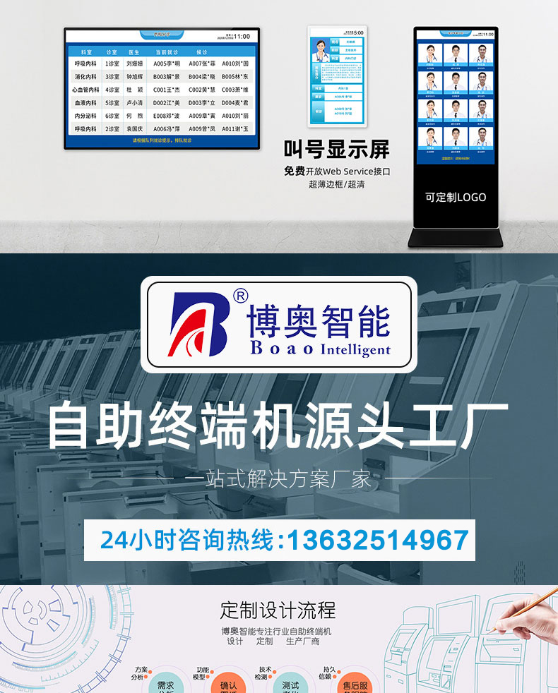 自助終端機(jī)定制:定制各種場景各種款式非標(biāo)終端機(jī);例如訪客機(jī)、景區(qū)自助取票機(jī)、醫(yī)院繳費(fèi)查詢機(jī)、醫(yī)院自助取單機(jī)、社保查詢機(jī)、室內(nèi)外廣告機(jī)、排隊(duì)叫號機(jī)、工控一體機(jī)、電力繳費(fèi)查詢機(jī)、圖書自助銷售機(jī)、便攜式計(jì)算機(jī)、酒店自助入住機(jī)、自助收銀機(jī)等終端。