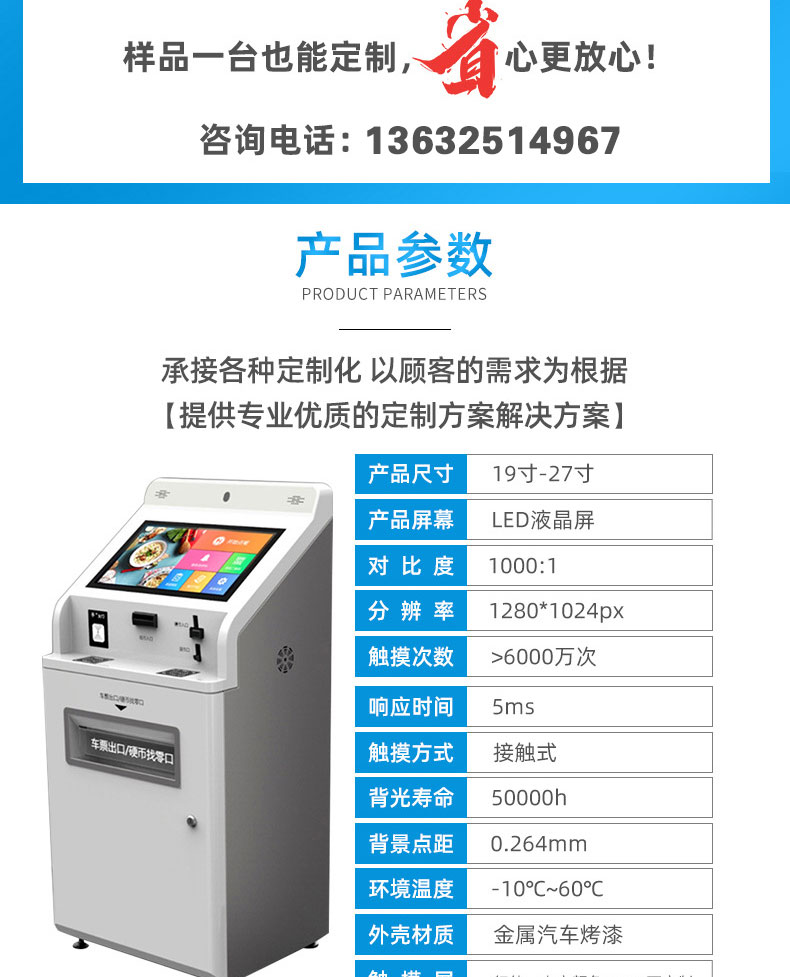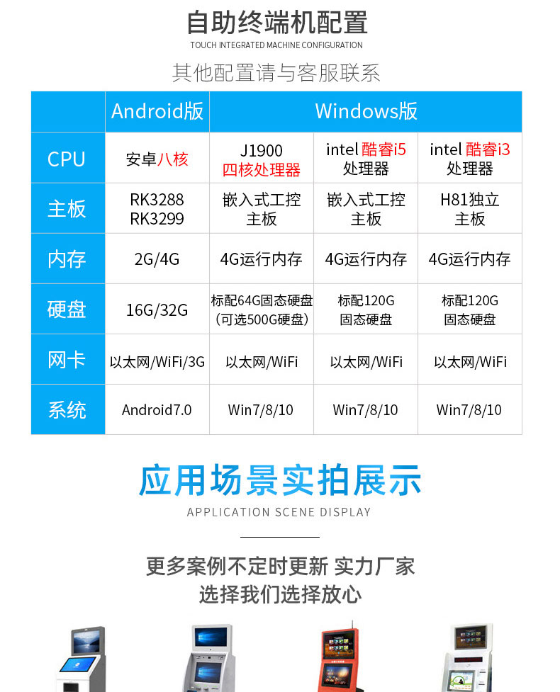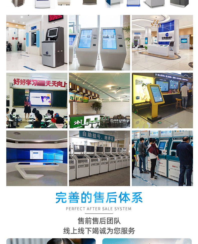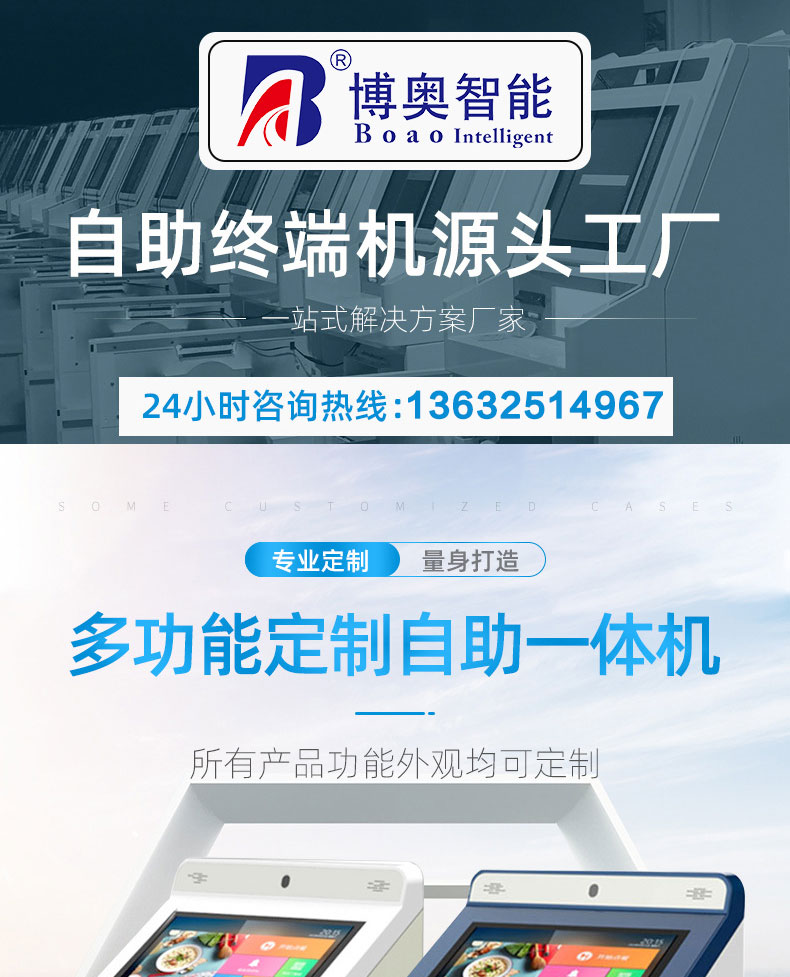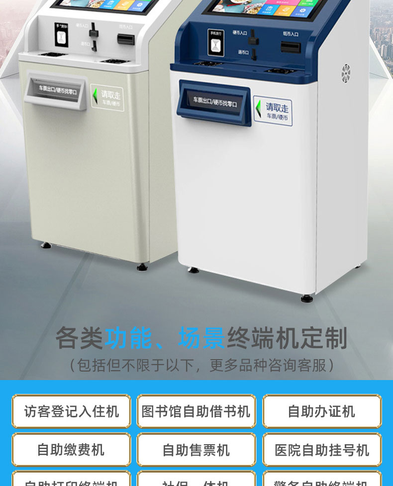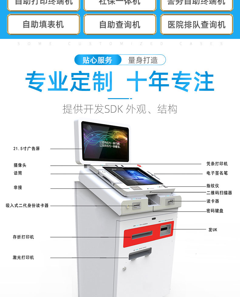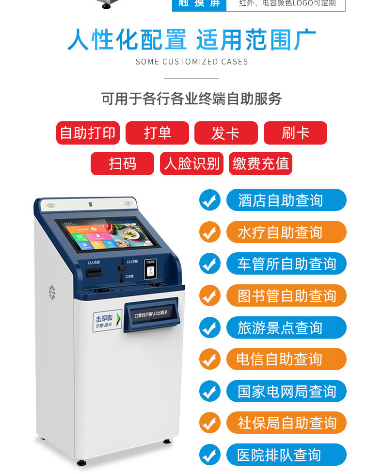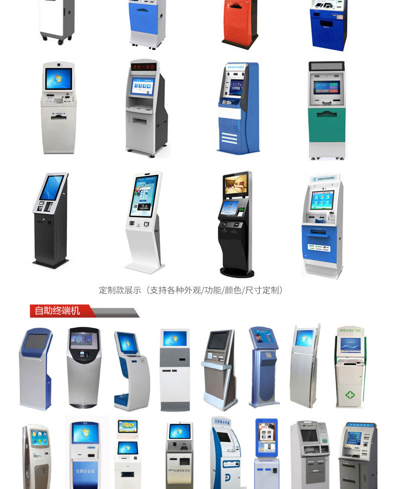 自助終端機定制:定制各種場景各種款式非標終端機;例如訪客機、景區自助取票機、醫院繳費查詢機、醫院自助取單機、社保查詢機、室內外廣告機、排隊叫號機、工控一體機、電力繳費查詢機、圖書自助銷售機、便攜式計算機、酒店自助入住機、自助收銀機等終端。