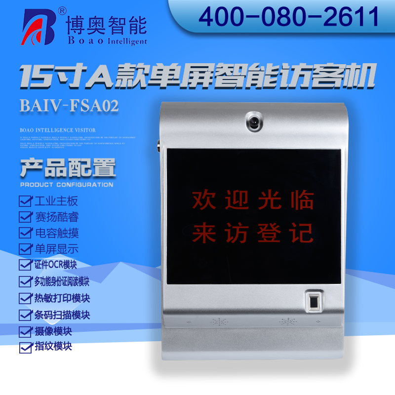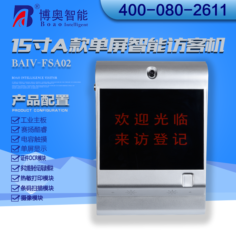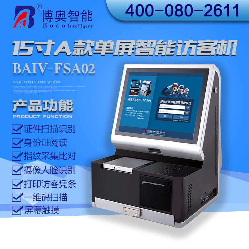 ? ? ? ?15寸A款雙屏智能訪客機利用計算機、觸摸屏手寫、證件識別(OCR),射頻識別、指紋生物識別、熱敏打印、條碼、數碼攝像、自動制證、硬件加密、網絡等技術實現智能信息化訪客登記管理,將目前手工填寫出入登記管理、電話咨詢被訪人等傳統方式轉變為高科技的計算機化、信息數字化處理,消除了手寫登記填寫時間長,容易出錯,信息缺失虛假多,不易保存,信息查詢困難等種種弊端;訪客登記管理系統能夠準確快速的對來訪人員的證件、圖像、指紋等信息進行識別登記并保存,以便日后查詢,同時利用聯動功能,可以對進出車輛自動識別登記。
