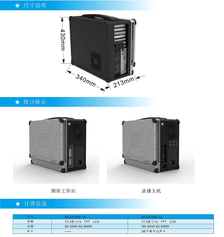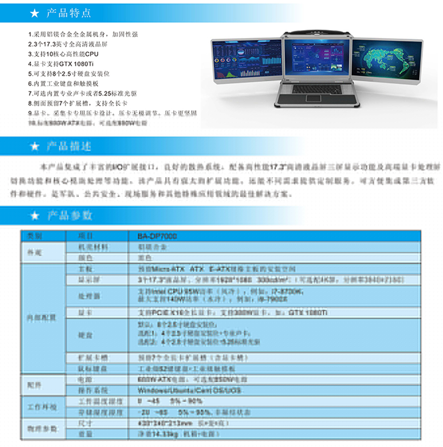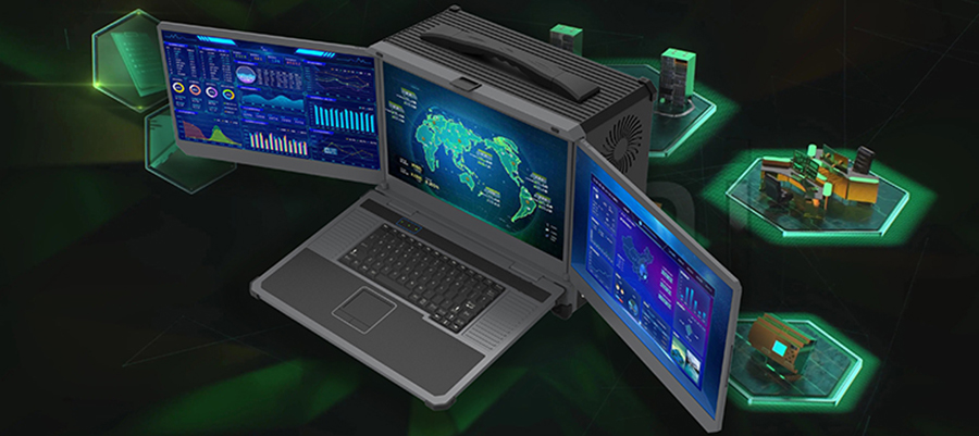 便攜式三屏計算機采用鋁鎂合金全金屬機身,加固性強,外觀精美,體積輕巧,方便攜帶,達到工業級性能;本產品集成了豐富的I/O擴展接口, 良好的散熱系統, 配備高性能17.3"高清液晶屏,三屏顯示功能及高端顯卡處屏切換功能和核心模塊處理等功能, 該產品具有強大的擴展功能, 還能不同需求提供定制服務。可方便集成第三軟件和硬件。是軍隊、公共安全、現場服務和其他特殊應用領域的最佳解決方案!