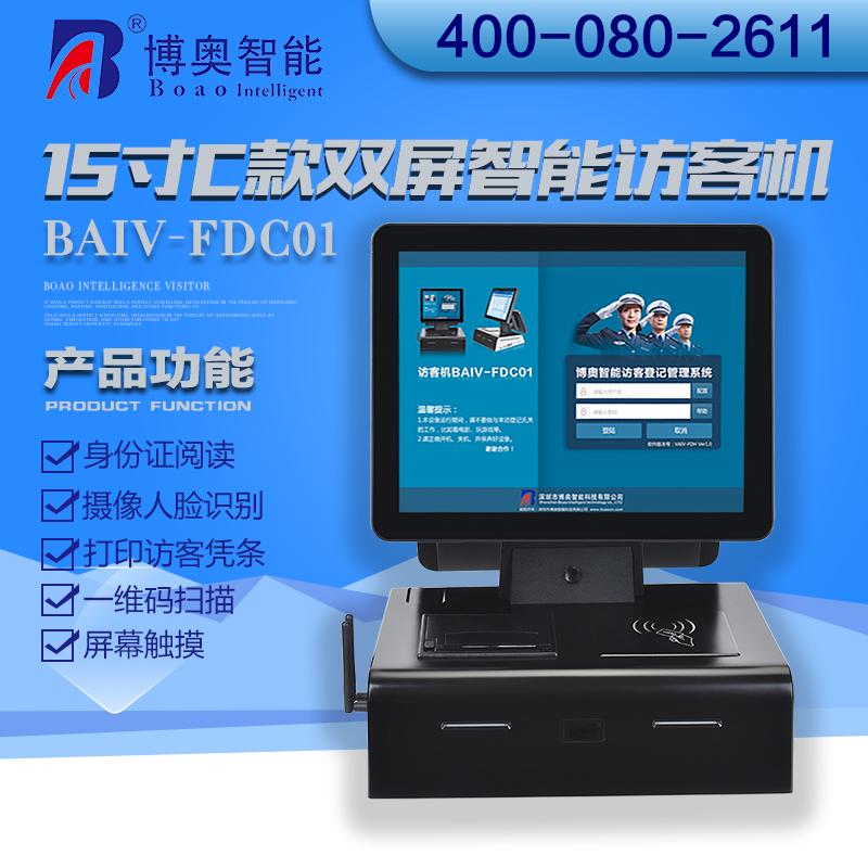 ? ? ? 15寸C款雙屏智能訪客機主要用在政府機關、關口、機場、軍隊、公安、法院、學校、事業單位、花園小區、高檔寫字樓、工廠等門衛傳達室用來訪客登記管理;辦公大廳、營業大廳、醫院等場所做為辦公設備