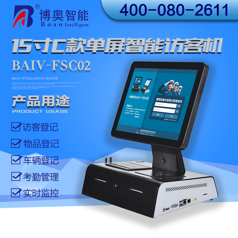 15寸C款單屏智能訪客機主要用在政府機關、關口、機場、軍隊、公安、法院、學校、事業單位、花園小區、高檔寫字樓、工廠等門衛傳達室用來訪客登記管理;辦公大廳、營業大廳、醫院等場所做為辦公設備