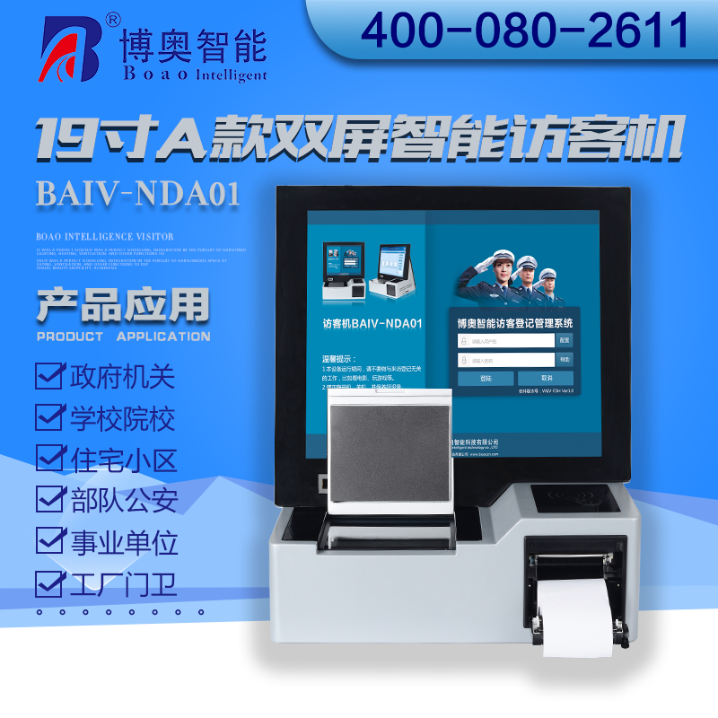 ? ? ? 19寸A款雙屏智能訪客機主要用在政府機關、關口、機場、軍隊、公安、法院、學校、事業單位、花園小區、高檔寫字樓、工廠等門衛傳達室用來訪客登記管理。